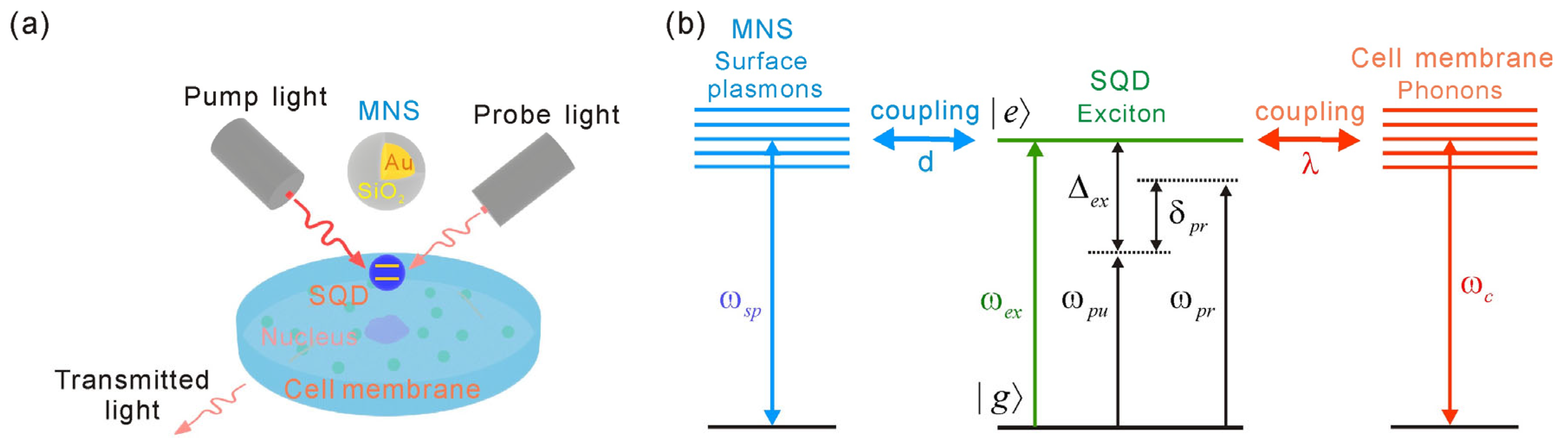 21]. However, to the best of our knowledge, no studies have yet focused on OB behaviors in an SQD-MNS–cell membrane. Investigating OB in this system is not only scientifically meaningful but also practically valuable. Additionally, the bistable properties in this system may enable the development of highly sensitive optical switches tailored for biomedical applications. Specifically, the synergistic coupling between the SQD, MNS, and cell membrane is expected to endow the system with enhanced optical responsiveness, which cannot be achieved by binary hybrid system alone. In the present paper, we therefore investigate the influences of key parameters (including pump intensity, interparticle distance, exciton–phonon coupling strength, and dielectric shell thickness) on the bistable effect in an SQD-MNS–cell membrane hybrid system. Particularly, we discuss the feasibility of leveraging the tunable OB behaviors of this system for cancer cell detection, aiming to provide a new theoretical basis and technical reference for the design of next-generation biosensors.