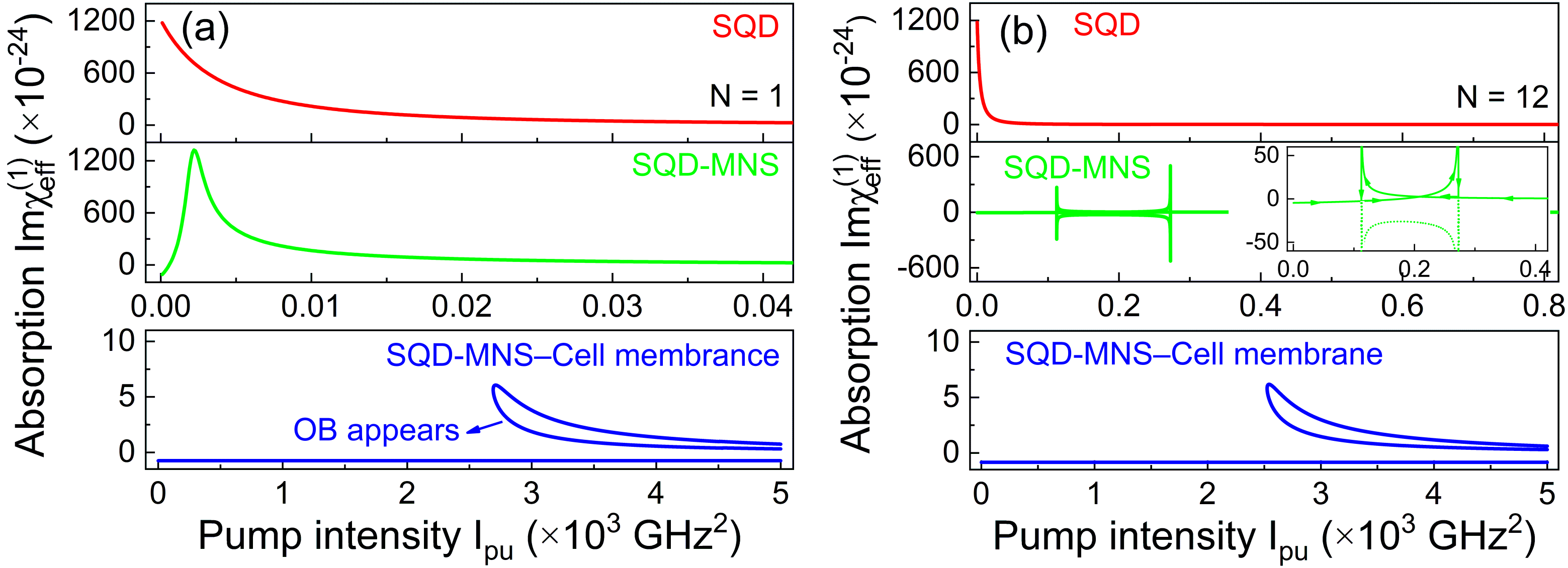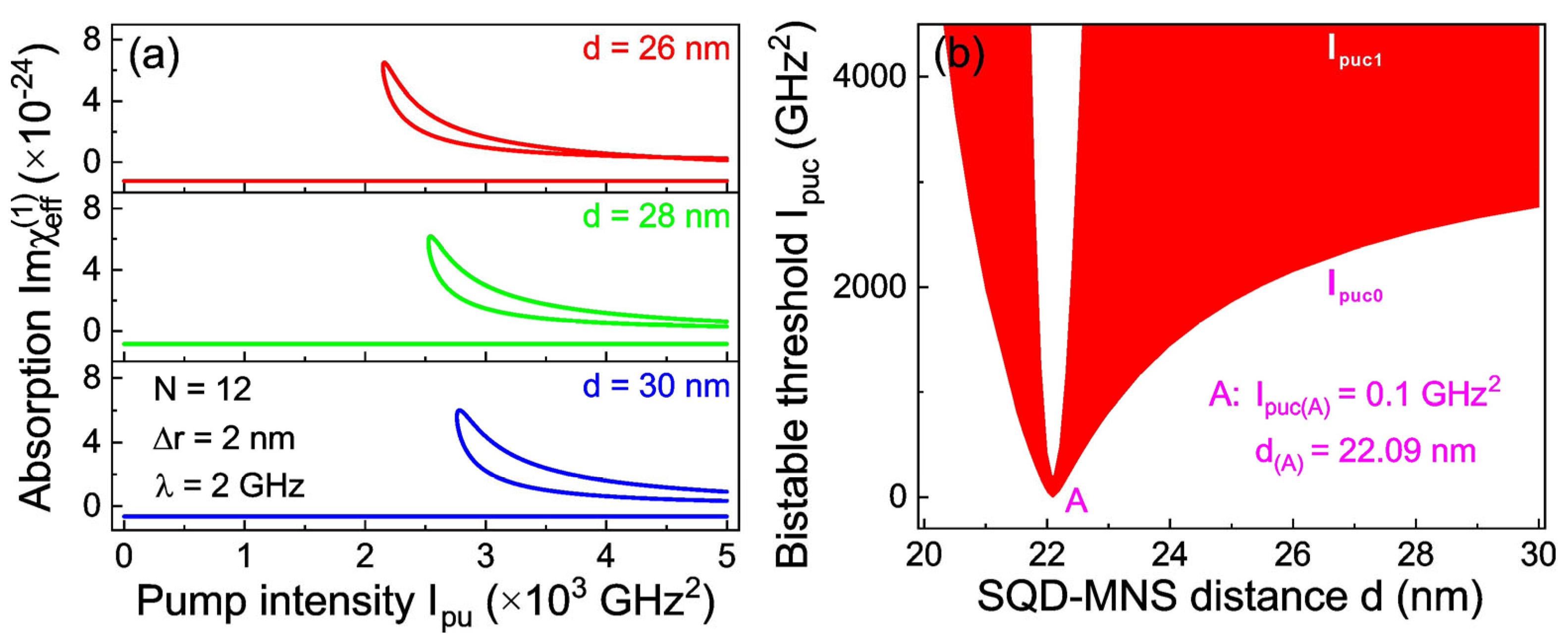 17]. They further demonstrated that, for a given intermediate scaled pumping intensity in an SQD–metallic nanoshell (MNS) hybrid system, multipole polarizations not only narrow the bistable zone but also enlarge the corresponding thresholds [