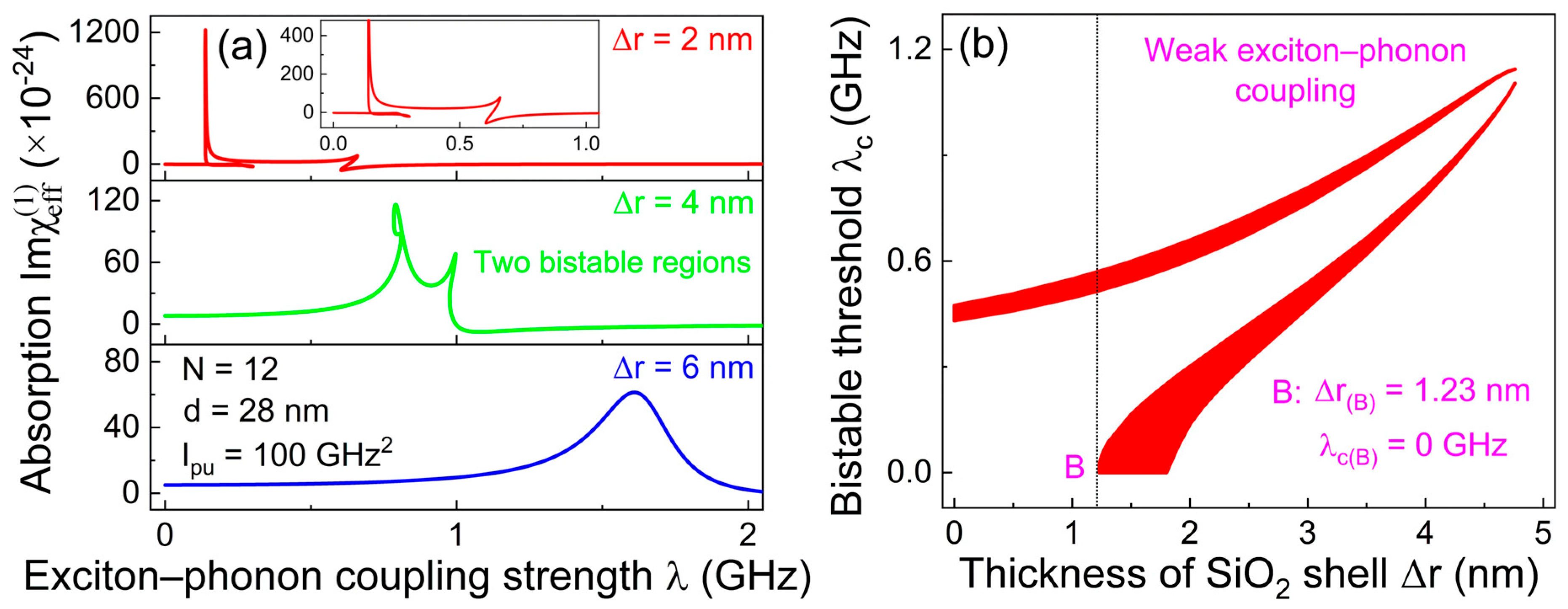 r exceeds 2.86 nm, the system enters region ③, where the bistable effect is smeared out, thereby indicating that the bistable switch is turned off. Driven by the synergistic effect of the MNS shell dielectric confinement and the exciton–phonon coupling, the sequential evolution of the system’s bistable channels with dielectric shell thickness arises from the combined effect of exciton–plasmon and exciton–phonon couplings.
