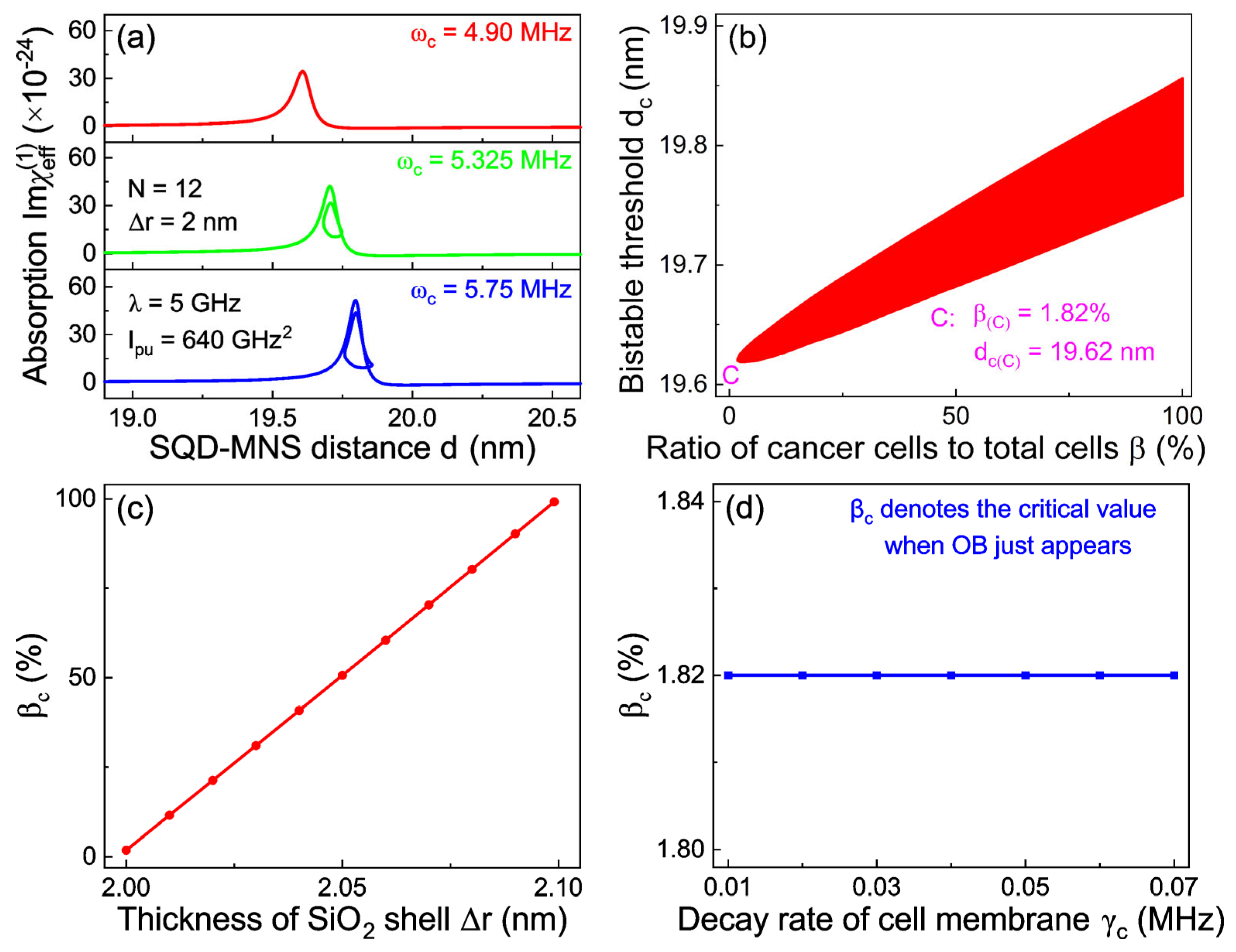 In contrast to conventional optical bistable devices, our SQD-MNS–cell membrane system offers three key advantages for cancer detection applications: (1) it enables label-free biosensing, where cell membrane biophysical parameters directly modulate bistable properties; (2) it supports low-power operation, as the synergistic effects of exciton–plasmon and exciton–phonon coupling efficiently lower switching thresholds; (3) it provides integrated diagnostic functionality, facilitating the simultaneous qualitative and quantitative analysis of cellular malignant transformation.