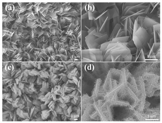 FE-SEM images of (a,b) EA ZnCo-LDH and (c,d) EA ZnCo-LDH/NCS electrodes at different magnifications.