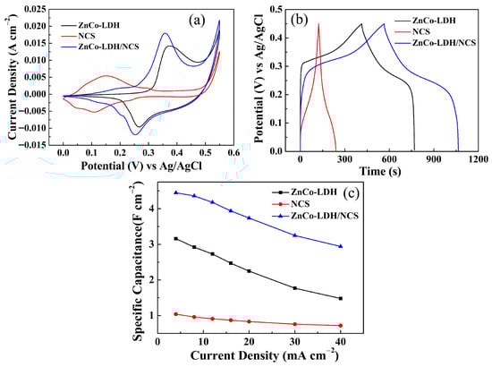 Figure 4a compares the CV curves (recorded at 5 mV s−1 in 2 M NaOH) of the ZnCo-LDH, NCS, and ZnCo-LDH/NCS electrodes. The composite electrode exhibits the strongest current response, substantially exceeding those of the single-component ZnCo-LDH and NCS electrodes, indicating superior energy storage capability. Consistently, GCD tests at 4 mA cm−2 (Figure 4b) reveal that the ZnCo-LDH/NCS electrode affords the longest discharge time, followed by ZnCo-LDH, whereas NCS delivers the shortest. The pseudocapacitive behavior is attributed to the following electrochemical reaction [23,24,25]: