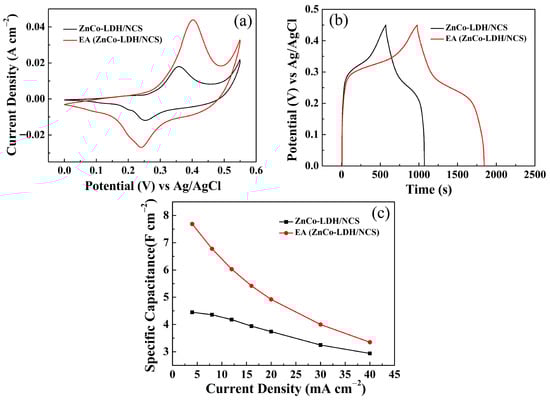 Electrochemical performance comparison of EA (ZnCo-LDH/NCS) and EA ZnCo-LDH/NCS electrodes: (a) CV curves; (b) GCD curves; (c) Cs at various current densities.