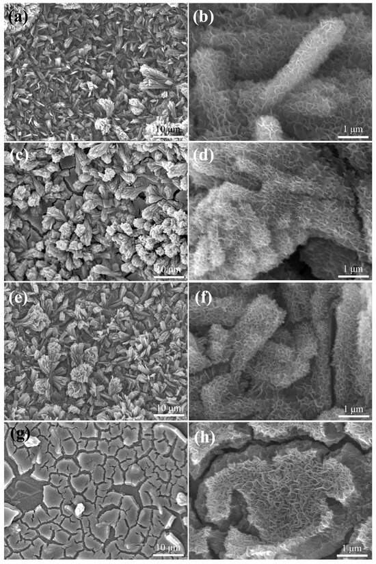 FE-SEM images of EA (ZnCo-LDH/NCS) electrodes activated in different KOH concentrations: (a,b) 1 M, (c,d) 3 M, (e,f) 5 M, and (g,h) 7 M.