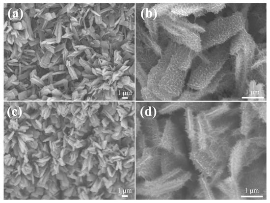 Figure 10a depicts the SEM image of hydrothermally grown ZnCo-LDH nanosheets after electrochemical activation. These dense nanosheets retain their original alignment on the NF substrate. At higher magnification, their surfaces appear extremely rough, as if short, thick filaments had been drawn out (Figure 10b). After NCS layer deposition (Figure 10c,d), the overall morphology closely matches that shown in Figure 6f.