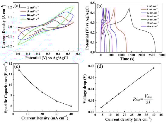 Therefore, the energy storage characteristics of the EA ZnCo-LDH/NCS electrode were systematically investigated. Figure 12a presents the CV curves recorded at various scan rates. Within a potential window of 0–0.55 V, the profile of the CV response remained essentially unchanged. As the scan rate increased, the peak positions shifted toward the edges of the window and the absolute value of current response progressively increased. In fact, lower scan rates allow for more extensive contact between the electrochemically active sites and the OH− in the electrolyte, thereby enabling a more complete electrochemical reaction [26]. The GCD curves recorded at various current densities are presented in Figure 12b. The results show that the electrode discharge time increases monotonically with decreasing current density. At a current density of 4 mA cm−2, the discharge duration reaches 1281 s, yielding a high Cs of 11.39 F cm−2 as calculated by the standard formula [27,28] (see Supplementary Materials). At 40 mA cm−2, the discharge duration is 90 s and the Cs is 7.99 F cm−2. This suggests that, at lower current densities, the prolonged residence time of OH− at the electrochemically active sites drives the redox reactions to completion, thereby enhancing charge storage utilization [29]. Figure 12c reveals the dependence of Cs on current density. Upon a ten-fold increase in current density, the Cs decays by only 29.85%. In addition, the voltage drop curve was plotted from the GCD test data, and the average RESR calculated using the inserted equation was 0.95 Ω cm−2 [24,27] (see Supplementary Materials).
