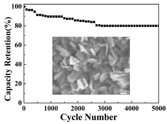 Cycling stability of the EA ZnCo-LDH/NCS electrode; the inset shows the post-test FE-SEM image.