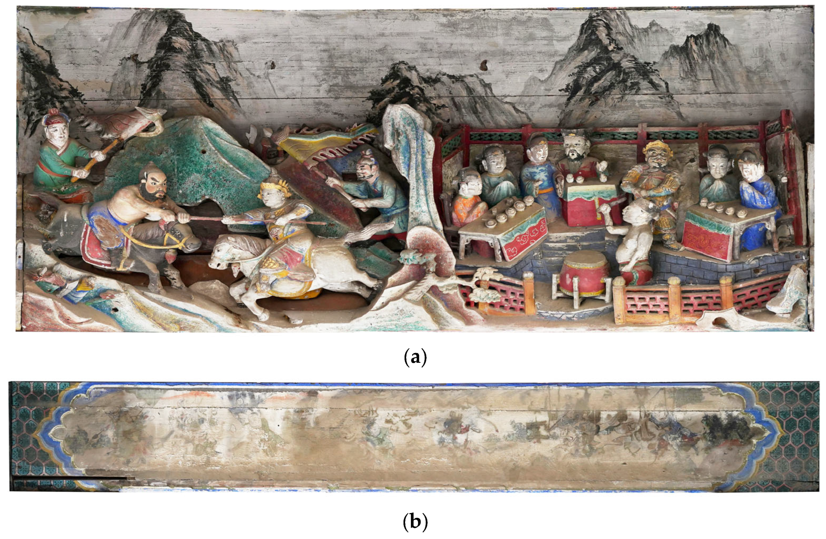 - Shen, J.; Li, L.; Zhang, D.; Dong, S.; Xiang, J.; Xu, N. A Multi-Analytical Approach to Investigate the Polychrome Clay Sculpture in Qinglian Temple of Jincheng, China. Materials 2022, 15, 5470. [Google Scholar] [CrossRef]
