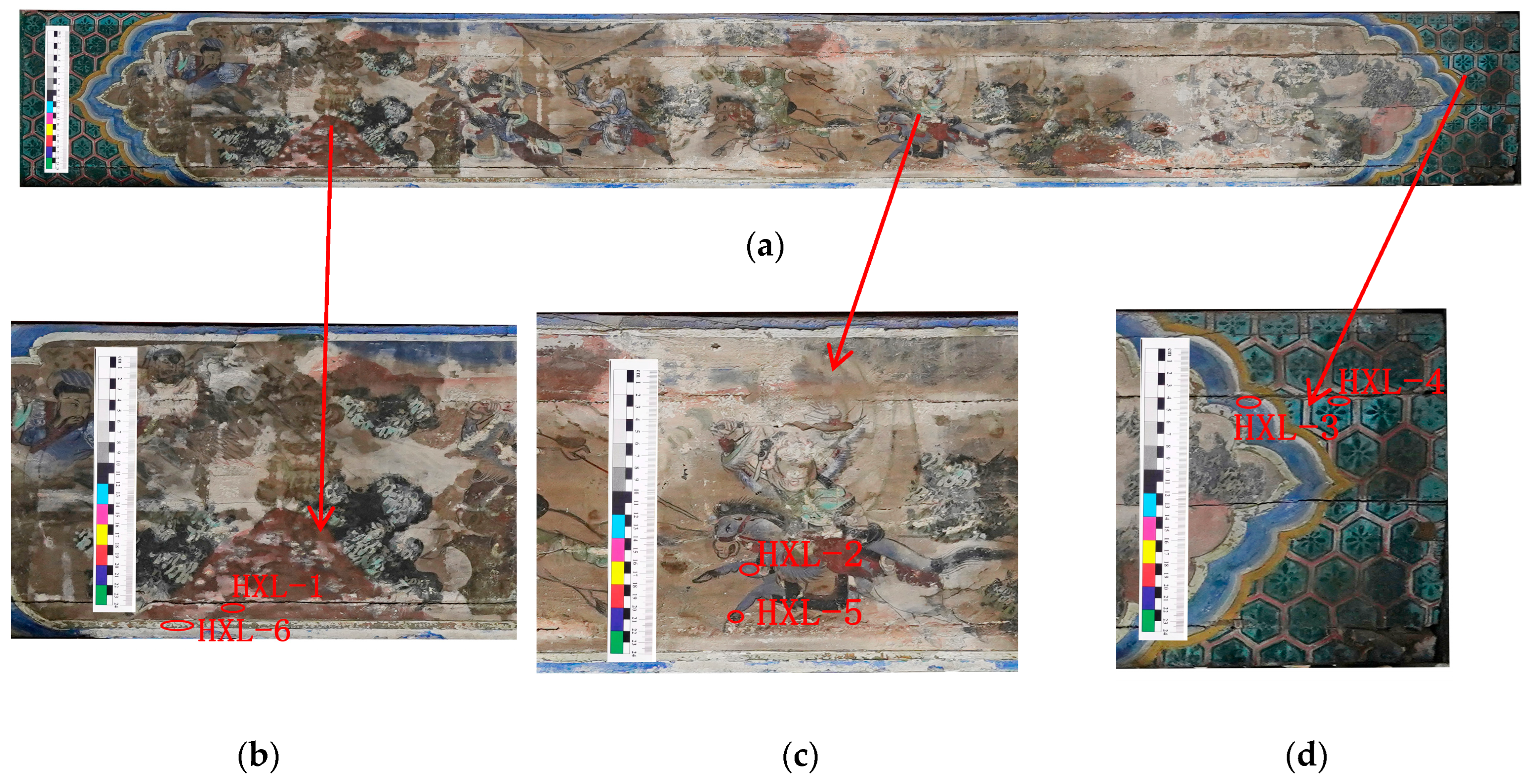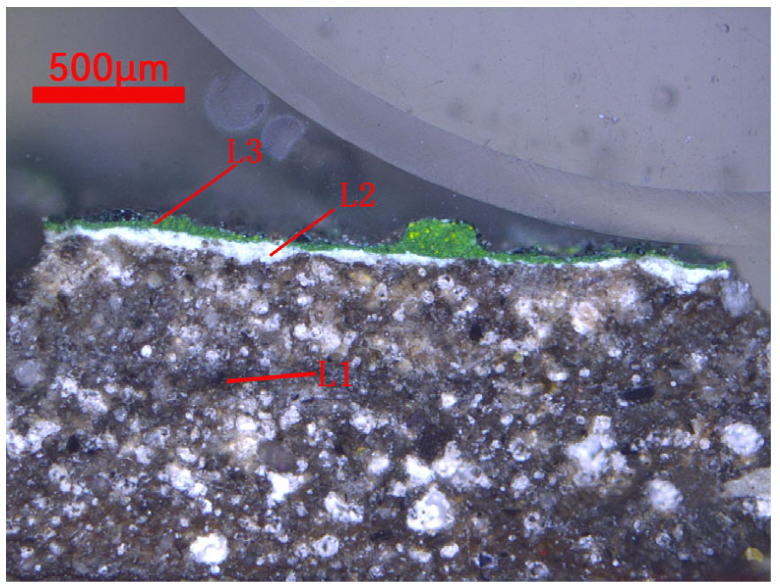 - Dong, S.; Xiang, J.; Ji, J.; Wang, Y.; Zhang, G.; Fu, P.; Han, J.; Li, L. Multi-Method Analysis of Painting Materials in Murals of the North Mosque (Linqing, China). Coatings 2023, 13, 1298. [Google Scholar] [CrossRef]