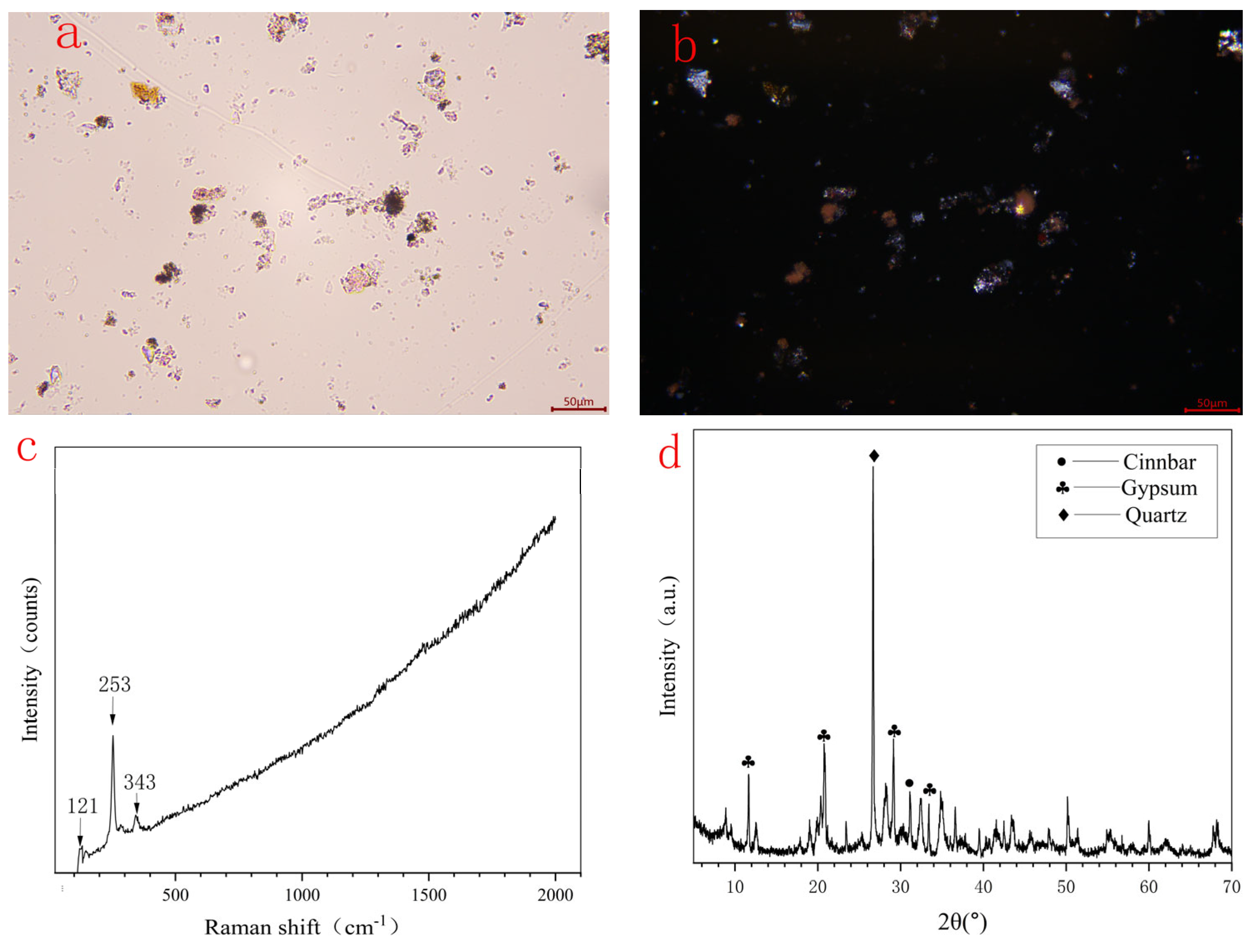 | HXL-1 | red | 121, 253, 343c | Pb (55.22), Hg (39.19), S (2.77) | Cinnabar (HgS) |