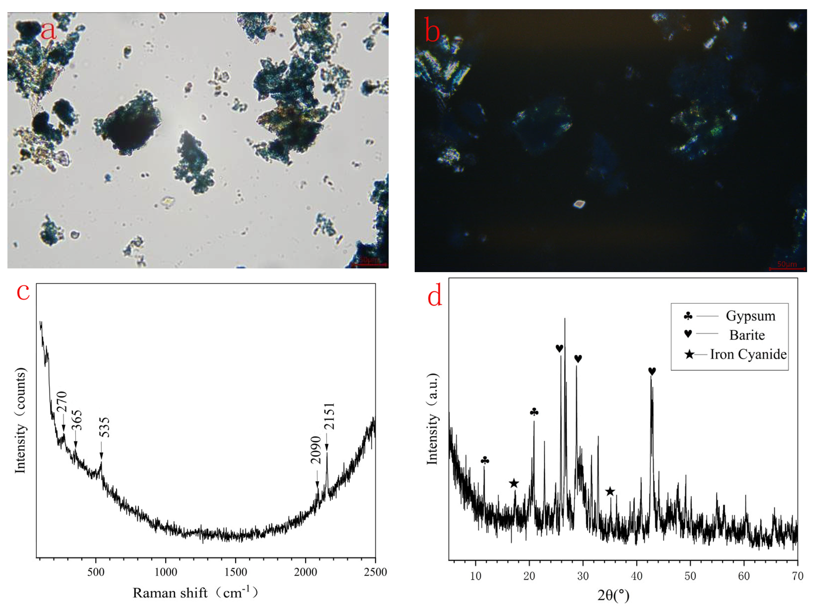 | HXL-2 | blue | 270, 365, 535, 2090, 2151 | Fe (68.08), Zn (2.65), Pb (1.23) | Prussian (Fe4[Fe(CN)6]3 |