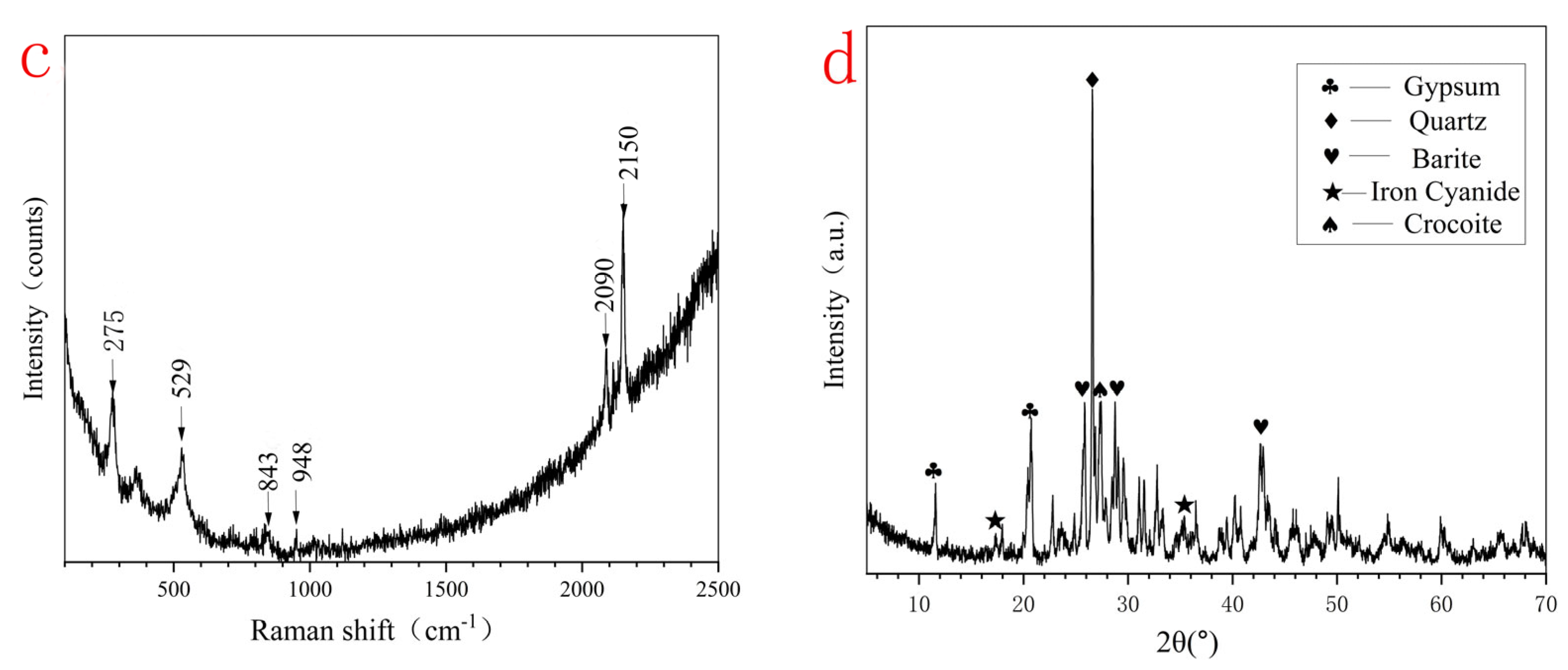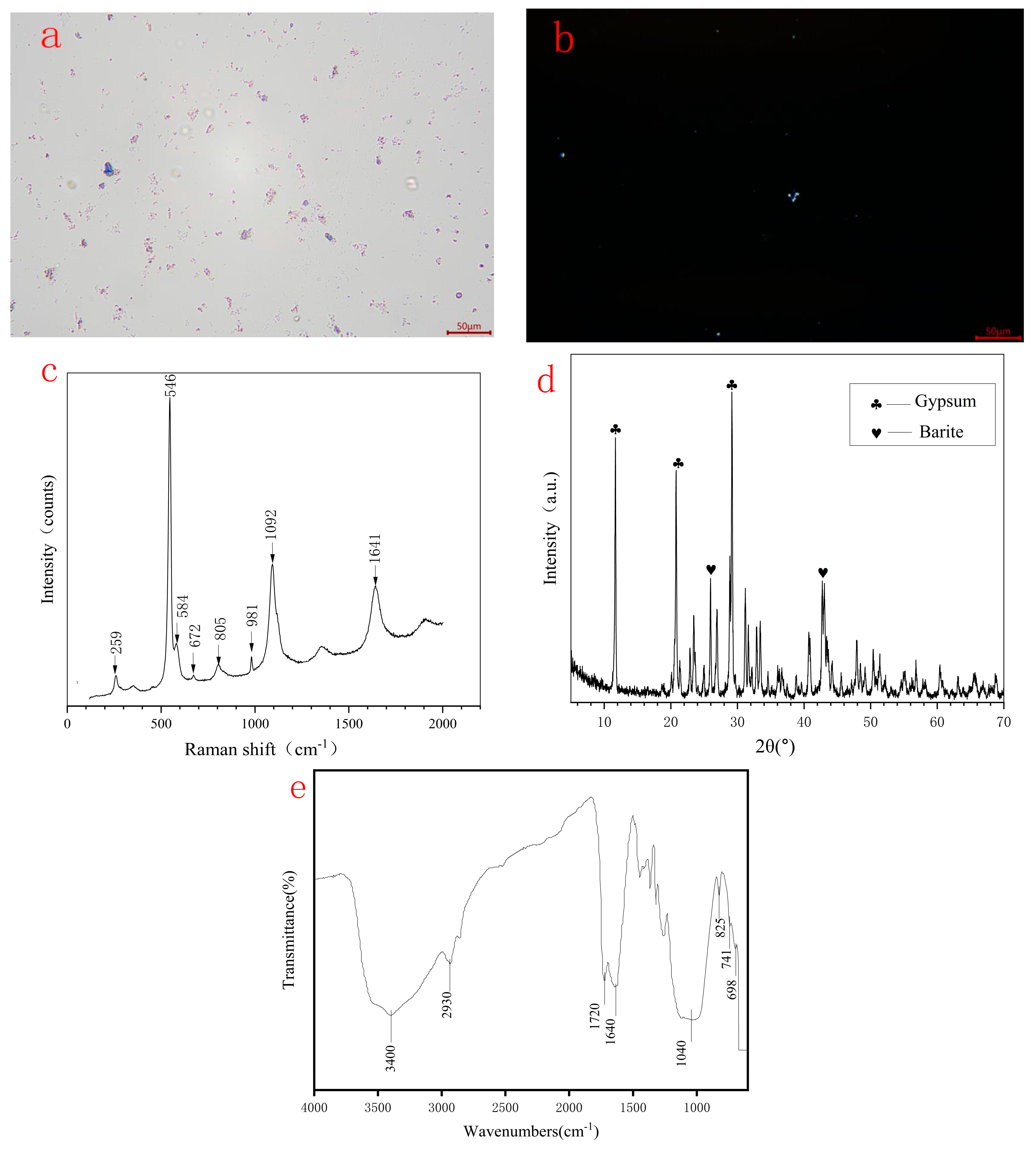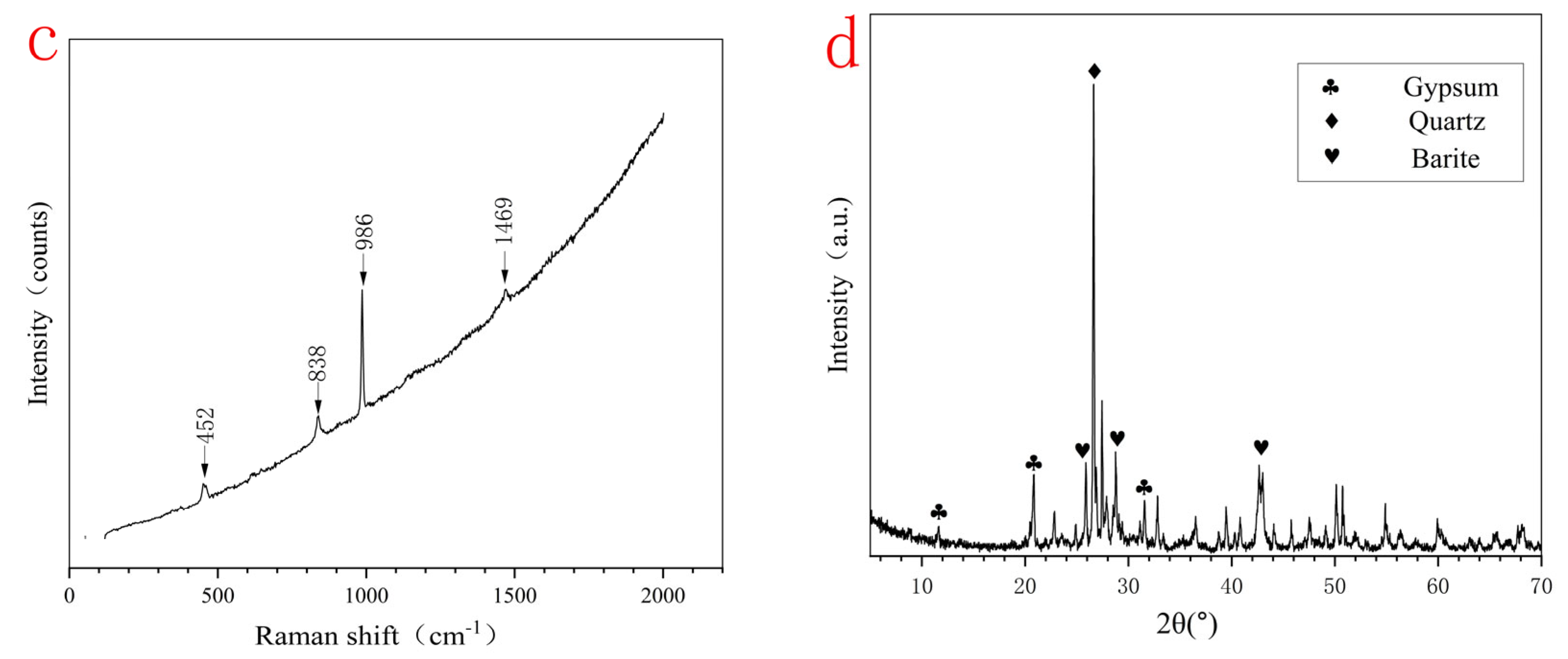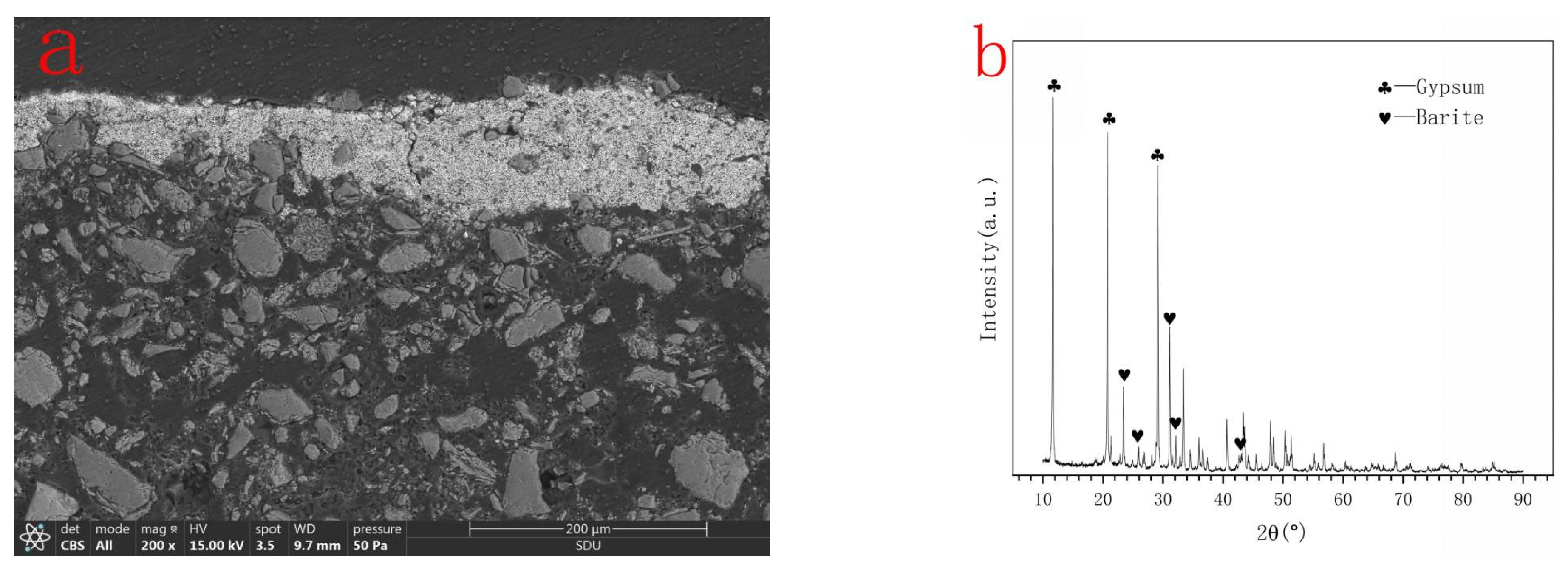 | HXL-6 | white | 452, 838, 986, and 1469 | S (22.59), Ca (14.41), Na (3.78), Al (1.38) | Gypsum (Ca(SO4)·(H2O)2) + Barite(BaSO4) |