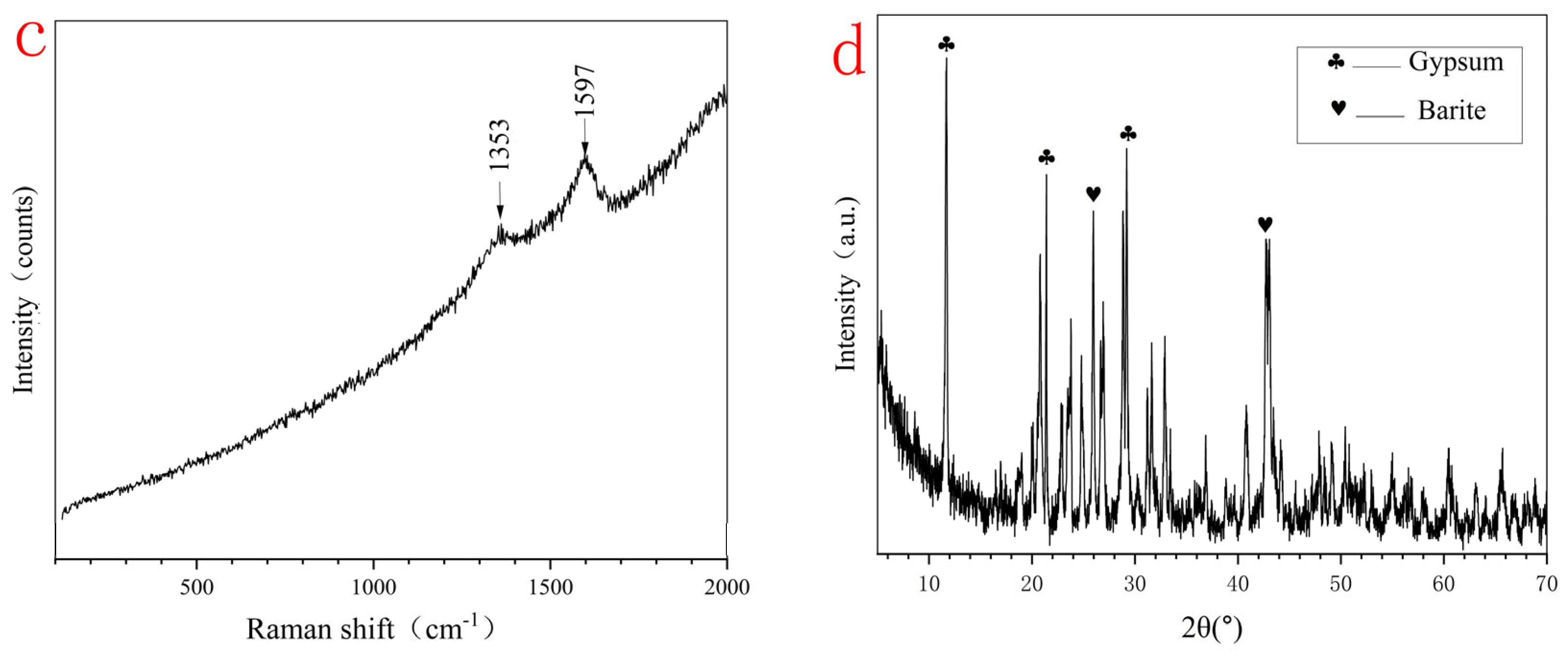 | HXL-5 | black | 1353, 1597 | Ba (3.91), S (3.76), Ca (0.43) | Carbon |