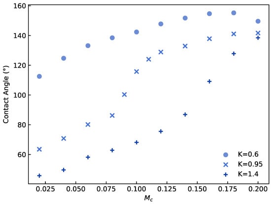 As shown in Figure 5, for different K values, the contact angle varies with in Equation (18). For , the minimum contact angle exceeds , and the wall remains hydrophobic as varies from 0 to 0.2, reflecting weaker solid-fluid attraction than fluid-fluid attraction. For and , the wall’s hydrophilicity increases with , and the tunable range of contact angle at exceeds that at .