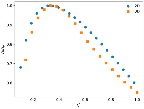 Differences between 2D and 3D simulations are analyzed. In Figure 7, is defined as , where is the contact time of the droplet with the wall. is the maximum spreading diameter of the droplet after impact. Compared with 3D simulations, 2D simulations show the same trend but somehow differ in absolute values; the maximum difference is about 10.2%. Due to limitations of computational resources, 2D simulations are used in this paper. It should be noted that 2D simulations can qualitatively capture the spreading and solidification behavior of droplets. However, 2D simulation might overestimate the droplet spreading ratio due to its less spreading degrees of freedom.