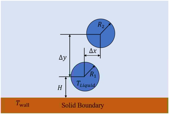 The numerical setup is illustrated in Figure 10. Two droplets, modeled in 2D, are placed in a sufficiently large simulation domain with vertical and horizontal separations of and , respectively. A low-temperature solid wall is located at the bottom.