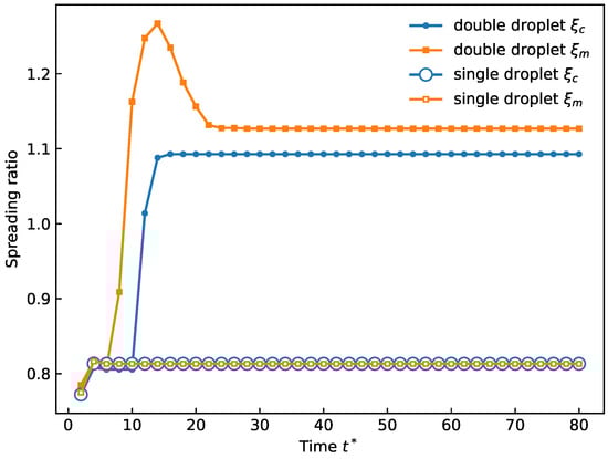 Figure 12 shows Two-droplet spreading ratios in CVP compared with a single droplet. Before collision, the spreading ratios of the two droplets coincide with that of a single droplet. At impact, the maximum spreading ratio rises sharply as deformation develops. The contact spreading ratio remains unchanged initially because the bottom region solidifies first. Once the deformed region meets the substrate, increases abruptly. Subsequent recoil of the upper portion reduces before complete solidification. After the bottom region solidifies, both and remain nearly constant.