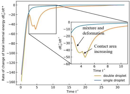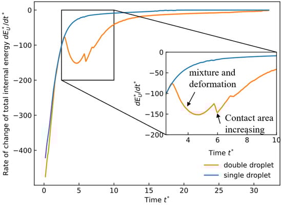 On the other hand, the temporal evolution of the internal energy change rate is investigated and compared with the single-droplet case. Figure 13 plots the dimensionless internal energy change rate for both the two-droplet and single-droplet cases. is defined as , where is the total internal energy at any time and is the initial total internal energy.