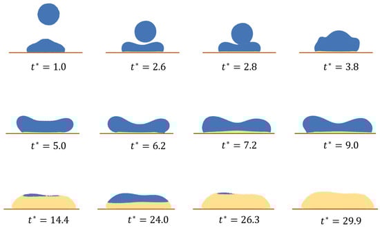 In Figure 11, denotes the dimensionless time, where . Figure 11 presents the collision and solidification process for the CVP. After solidification, the droplet exhibits a convex, mountain-like morphology.