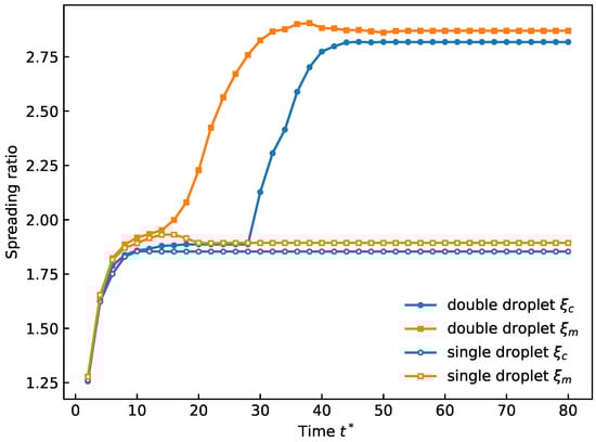 As shown in Figure 11, two kinds of spreading diameters are defined: the maximum diameter of the merged droplet , and the contact diameter , which is the diameter of the region in contact with the substrate. Thus, two kinds of spreading ratios are defined: