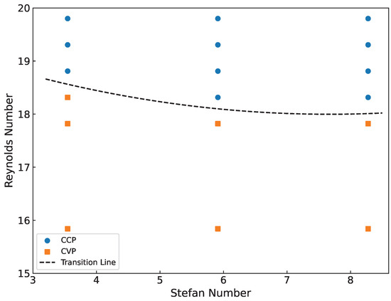 Relative to the pronounced effect of the Reynolds number on the solidification mode, the Stefan number has a much weaker influence. Low Stefan numbers lead to slower solidification speed and greater retraction, making CVP more likely than at high Stefan numbers. This slightly reduces the critical Reynolds number for the transition between CCP and CVP. Nevertheless, it should be noted the effect is minor and does not materially alter droplet solidification behavior.