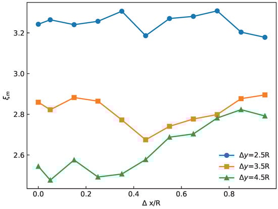 Figure 18 shows how varies with horizontal distance at different vertical distances . When , exceeds that of the other two cases for all and remains nearly constant. For , is smaller at but becomes larger at . For , increases with , reaching about 9.75% above the center collision case.