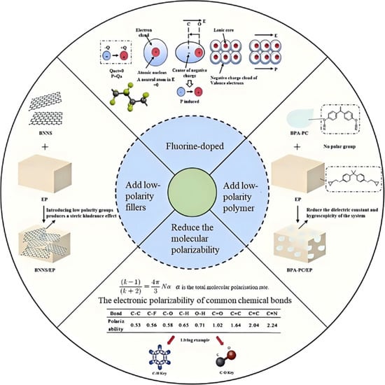 Copolymerization or blending with inherently low-polarity polymers represents an effective strategy for reducing the overall polarizability of epoxy resins [34]. This approach dilutes the concentration of polar groups within the material, effectively reducing the number of dipoles capable of reorienting under an electric field. Furthermore, the incorporation of bulky molecular segments or rigid conjugated structures introduces steric constraints that restrict the rotational mobility of intrinsic dipoles, particularly those associated with hydroxyl groups in the cross-linked network. This suppression of dipole motion thereby leads to a reduction in the system’s overall polarizability.