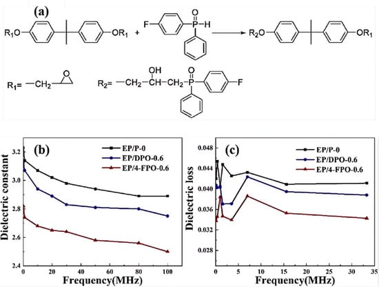 (a) Reaction of (4-fluorophenyl)(phenyl)phosphine oxide (4-FPO) with the diglycidyl ether of bisphenol A (DGEBA); (b) Dielectric constant of the modified epoxy resin; (c) Dielectric loss of the modified epoxy resin [25].