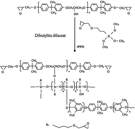 This modification strategy has been successfully implemented in several studies. For instance, H. J. Hwang et al. [37] synthesized a low-dielectric thermosetting system by curing a standard epoxy resin with a low-molecular-weight PPO oligomer containing a conjugated main-chain structure, which resulted in the formation of an interpenetrating polymer network (IPN). This IPN structure reduced the dielectric constant from 3.70 to 2.63 at 1 GHz. In a different approach, W. L. Weng et al. [38] prepared low-molecular-weight PPO (redistributed PPO, rPPO) via a redistribution reaction and blended it as a modifier into an epoxy resin (see Figure 3). The incorporation of rPPO significantly enhanced the overall material performance, yielding a dielectric constant of 3.76 and a dielectric loss tangent of 2.11 × 10−3 at 107 Hz, while also increasing the maximum thermal decomposition temperature to 421 °C.