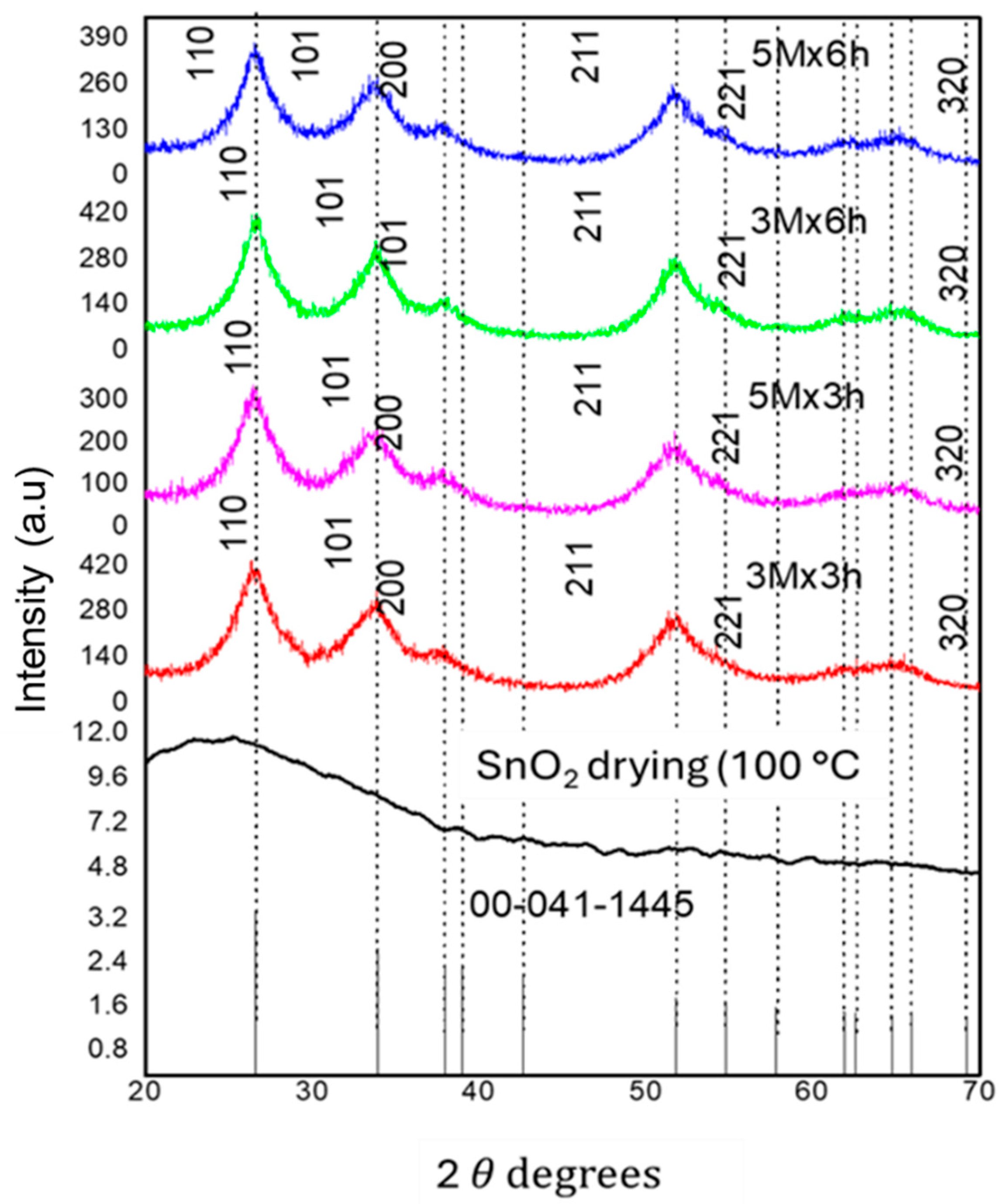 - Dontsova, T.A.; Nagirnyak, S.V.; Zhorov, V.V.; Yasiievych, Y.V. SnO2 Nanostructures: Effect of Processing Parameters on Their Structural and Functional Properties. Nanoscale Res. Lett. 2017, 12, 332. [Google Scholar] [CrossRef] [PubMed]