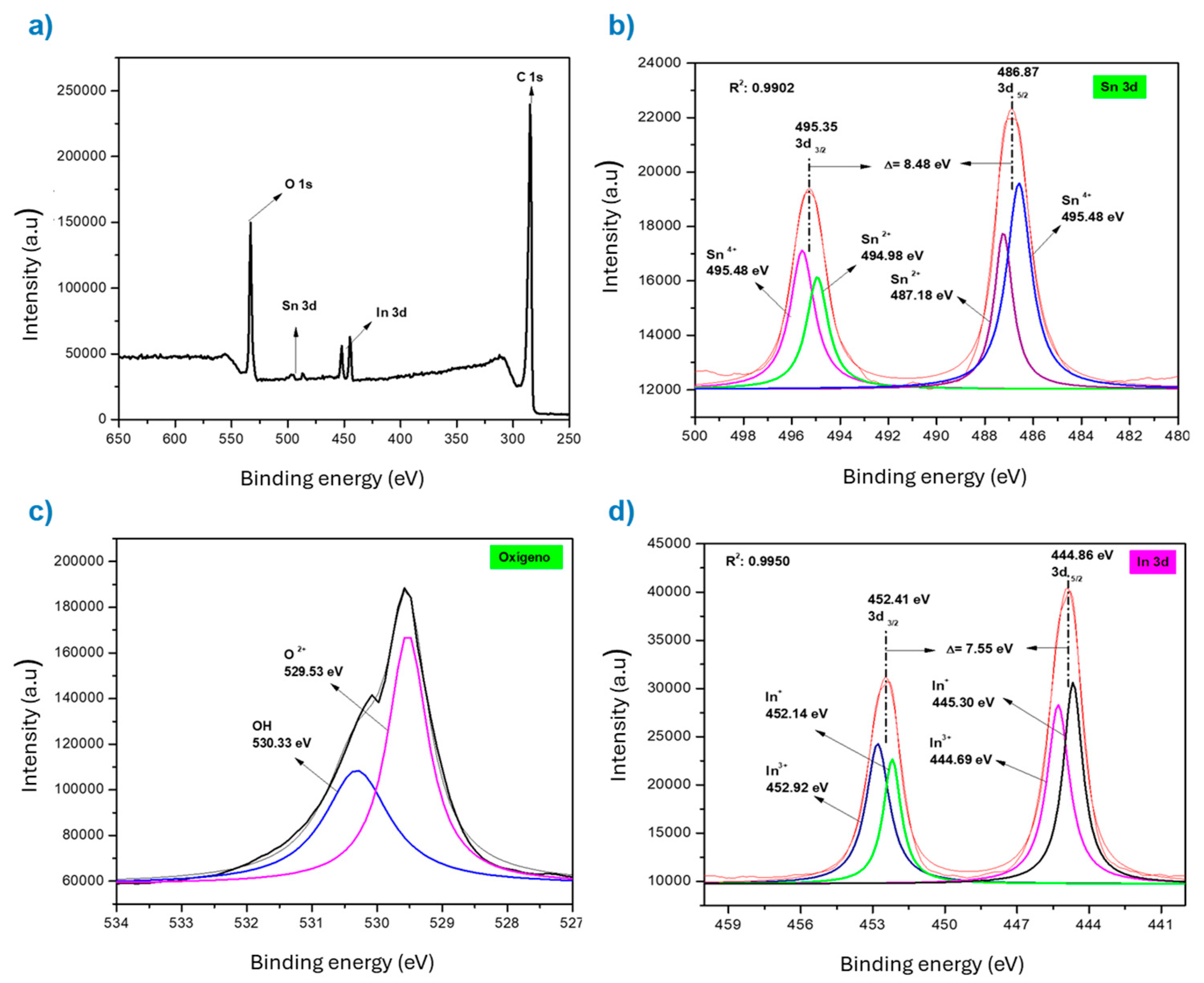- Petrovska, S.; Ilkiv, B.; Khyzhun, O.; Ohtsuka, M.; Sergiienko, R.; Voisin, L.; Nakamura, T. XPS investigation of indium-saving indium-tin oxide (ITO) thin films. Nanosistemi Nanomateriali Nanotehnologii. 2022, 20, 305–320. [Google Scholar] [CrossRef]