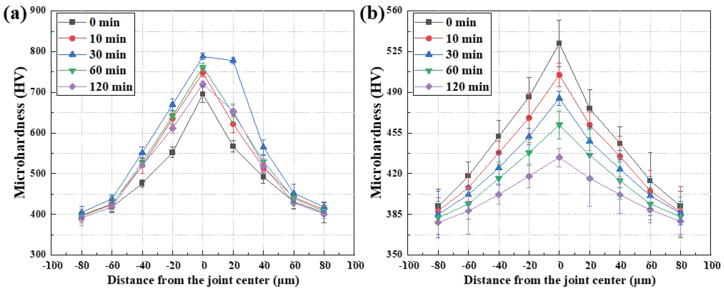 Table 4) display a progressive reduction in both hardness magnitude and spatial contrast with holding time. At 0 min, the joint center hardness is 532 ± 20 HV, compared with 392–418 HV in the substrate. With increasing holding time, the joint-center hardness decreases monotonically to 505 ± 10 HV (10 min), 485 ± 6 HV (30 min), 462 ± 12 HV (60 min), and 434 ± 8 HV (120 min). Simultaneously, the hardness range across the joint narrows substantially, with the maximum–minimum difference decreasing from approximately 140 HV at 0 min to less than 60 HV at 120 min. The relatively uniform standard deviations across the joint region (typically ±8–24 HV) further indicate reduced mechanical heterogeneity.