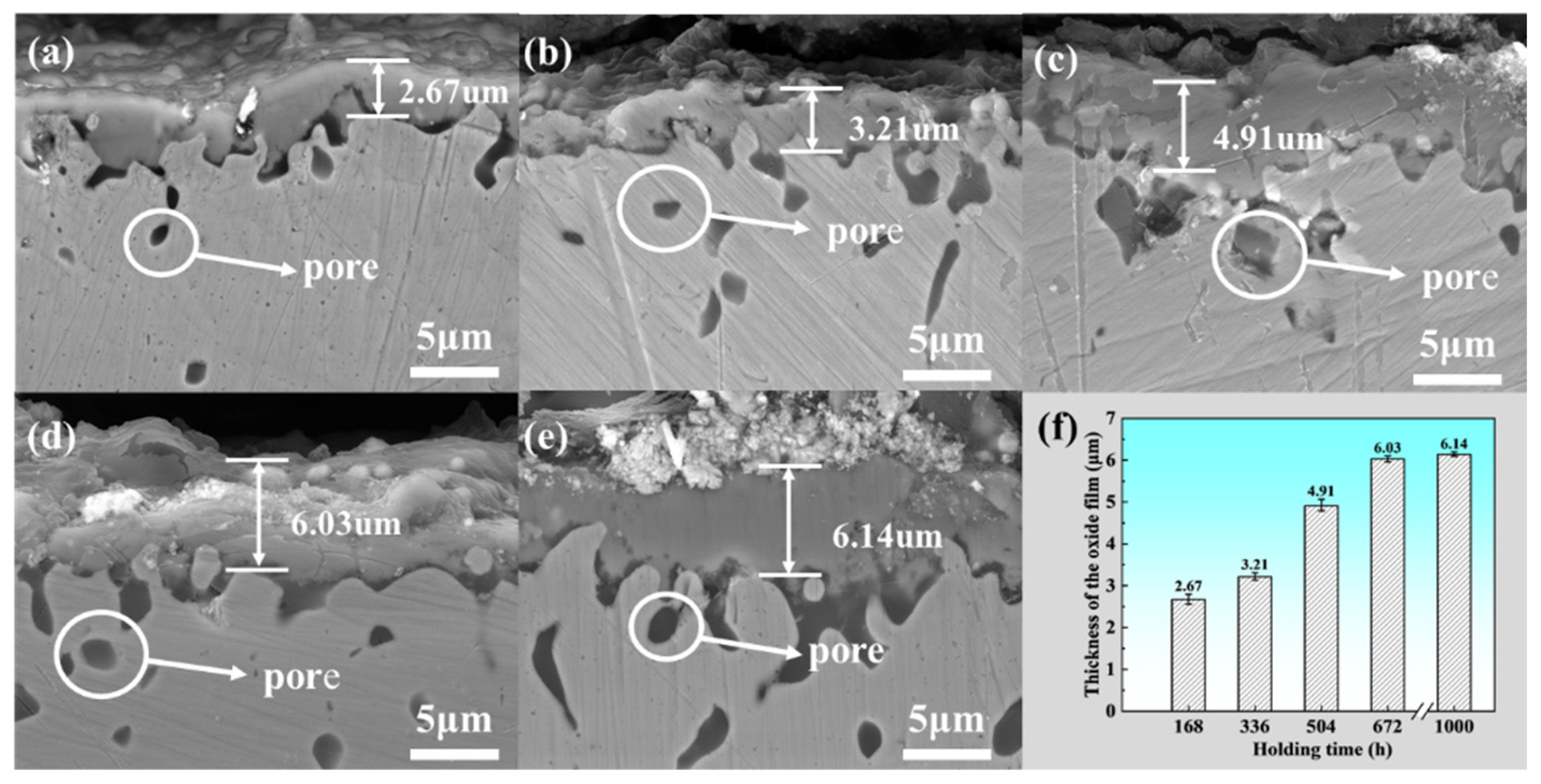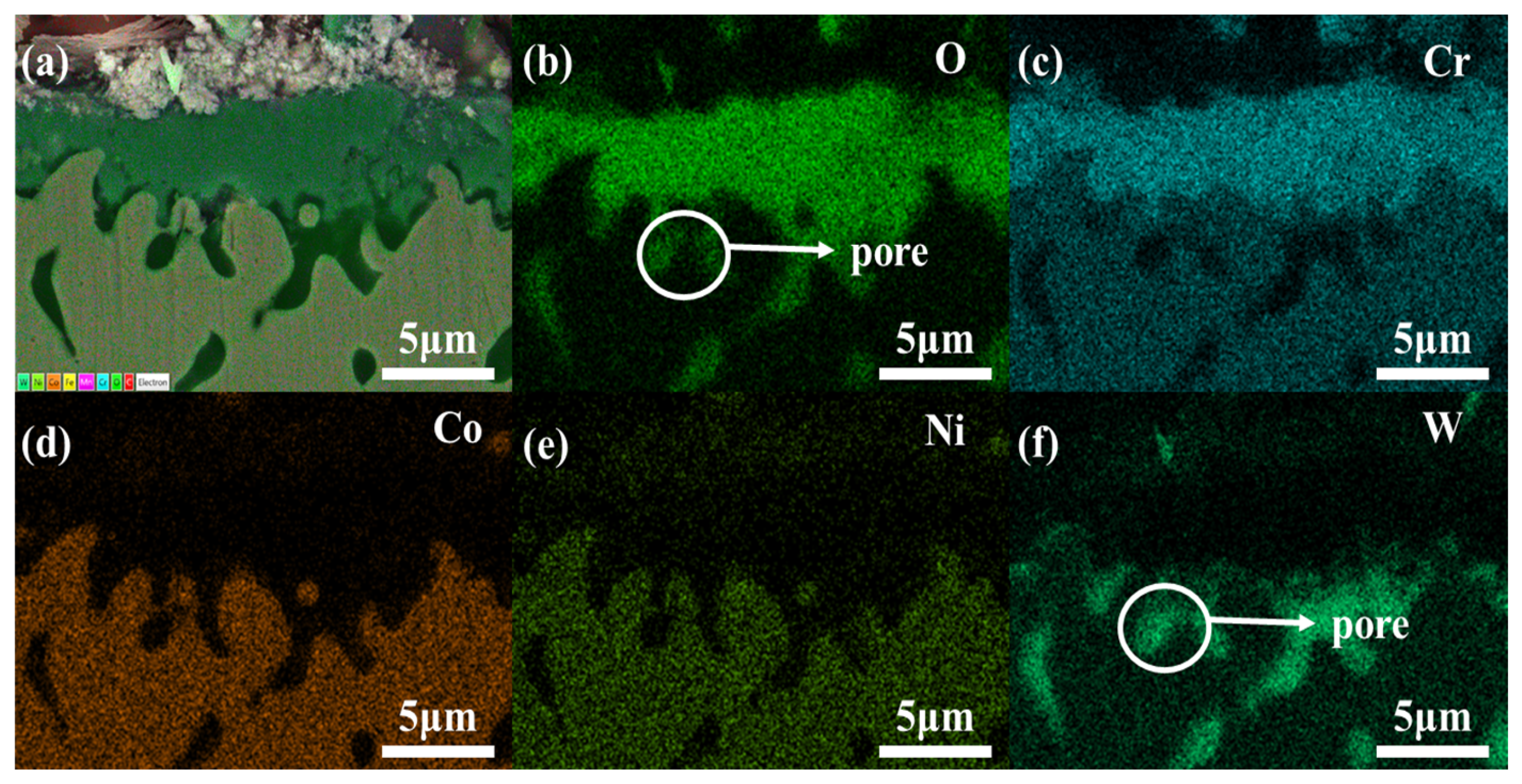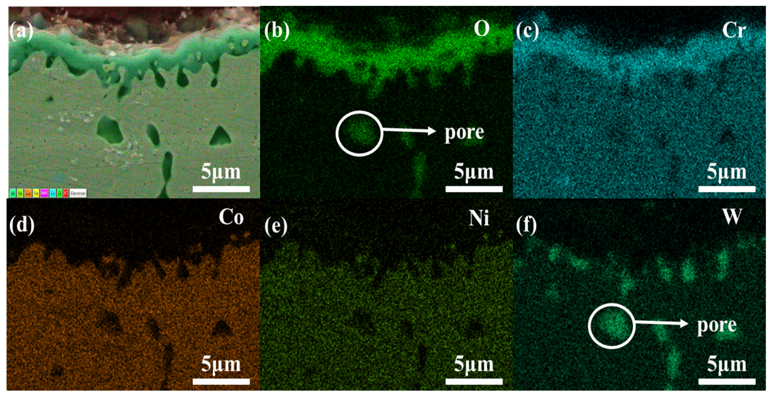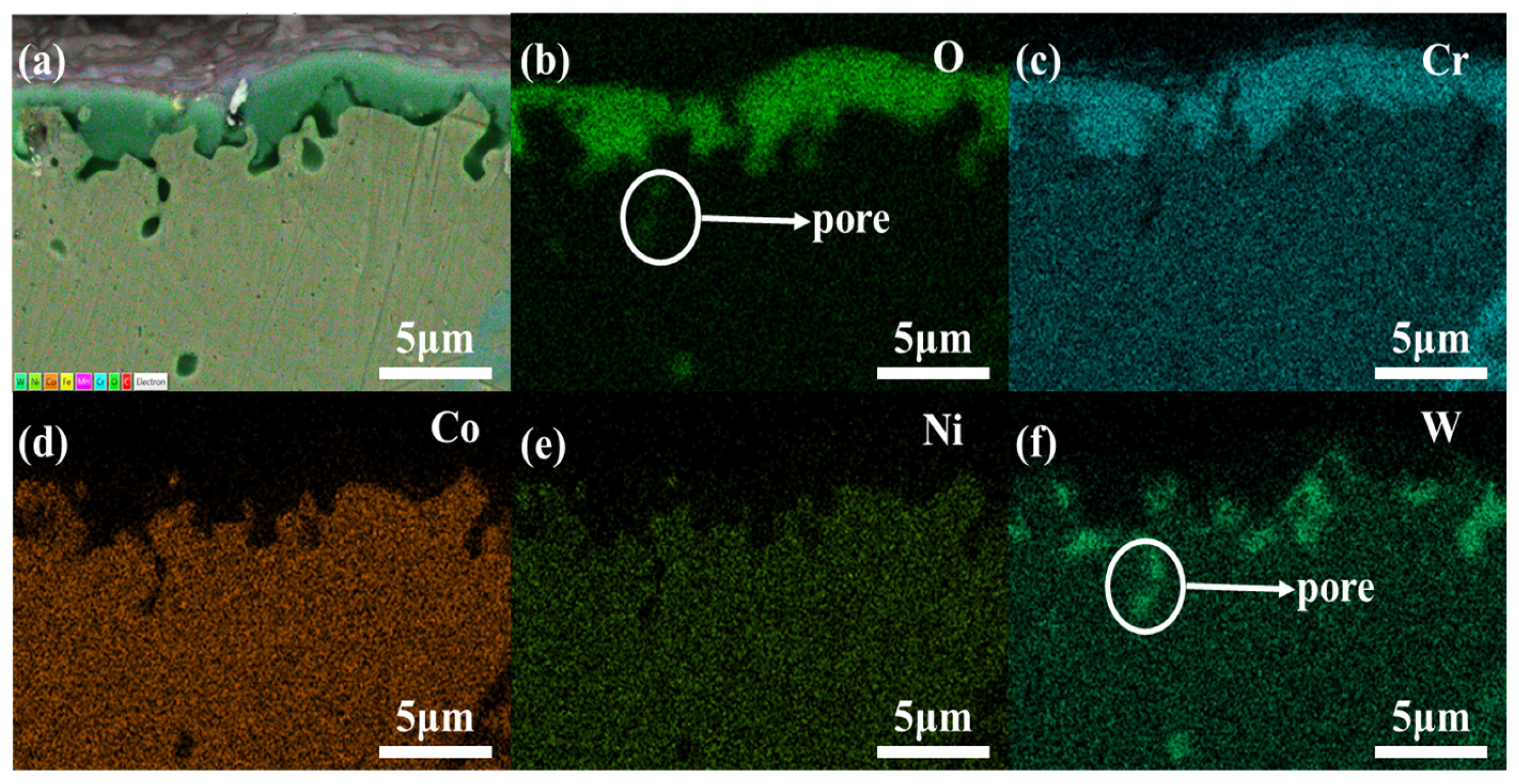 - More “pores” composed of W and O appeared near the oxide films, providing channels between the oxide film and the internal metal, accelerating the localized oxidation as the heating duration increased.