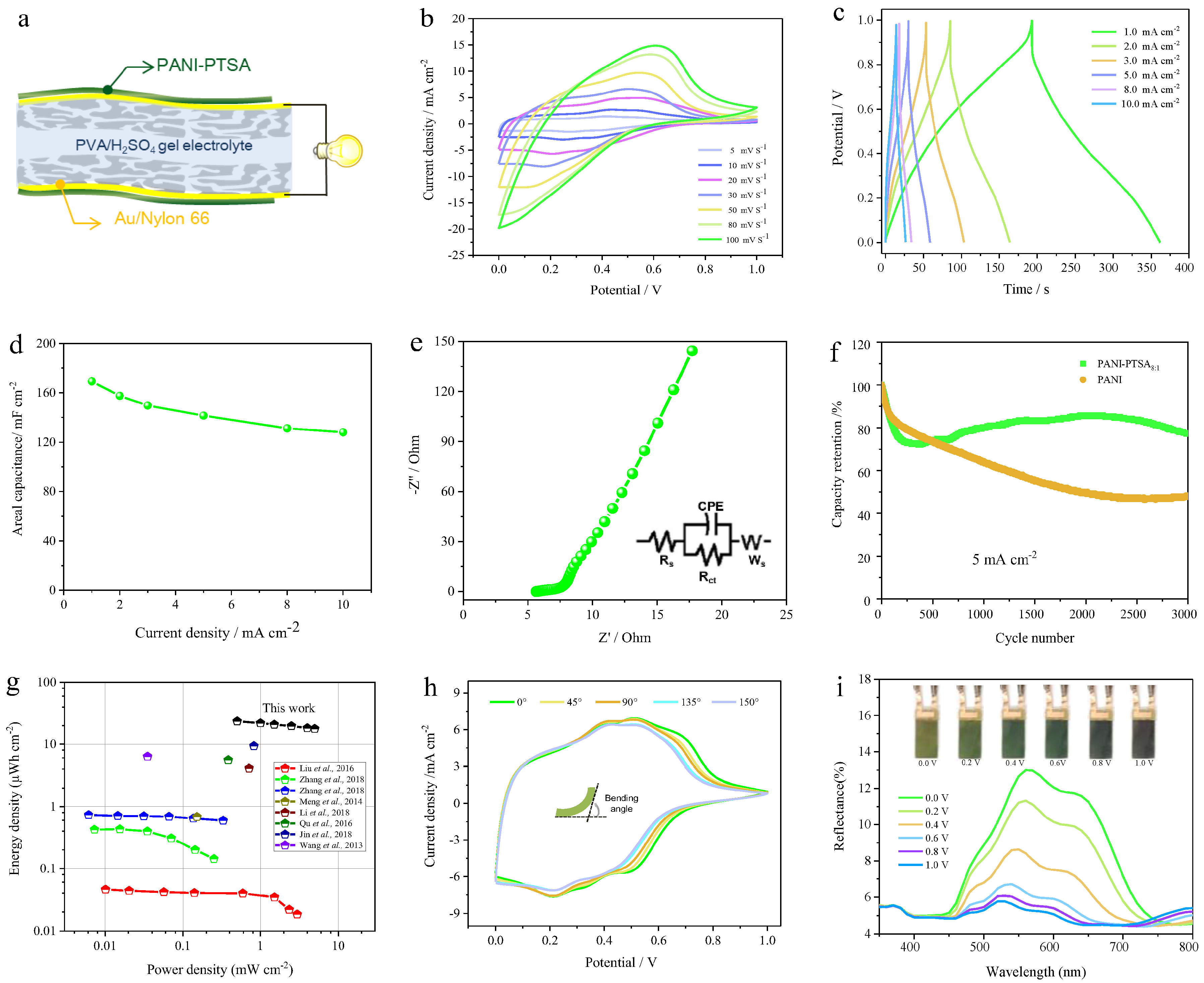 - Xu, K.; Zhou, K.-l.; Wang, H.; Liu, J.-b.; Yan, H. Electrochemical Cycling Stability of Polyaniline Films in Different Color Ranges. J. Electrochem. 2019, 25, 6. [Google Scholar]