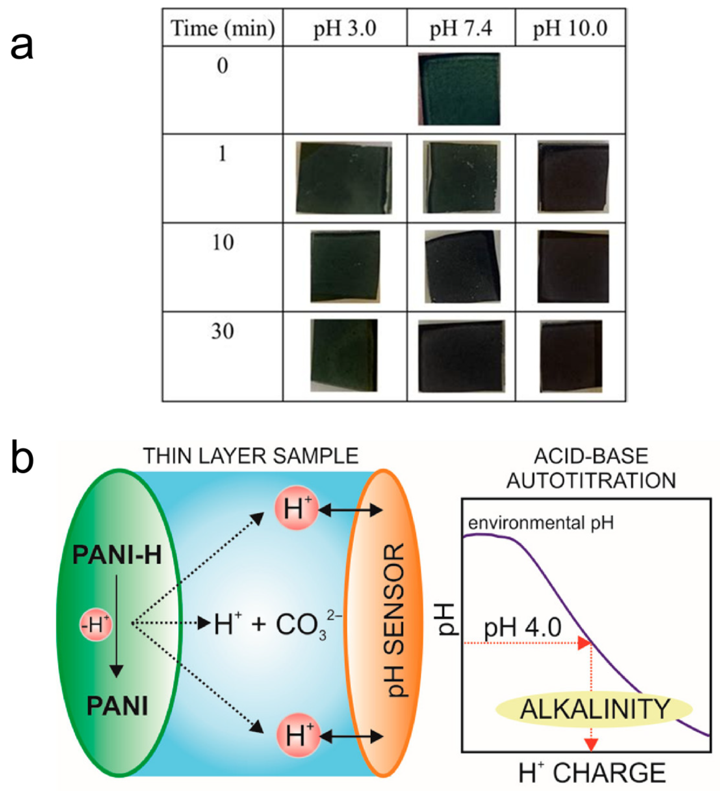 - Wiorek, A.; Cuartero, M.; De Marco, R.; Crespo, G.A. Polyaniline Films as Electrochemical-Proton Pump for Acidification of Thin Layer Samples. Anal. Chem. 2019, 91, 14951–14959. [Google Scholar] [CrossRef]