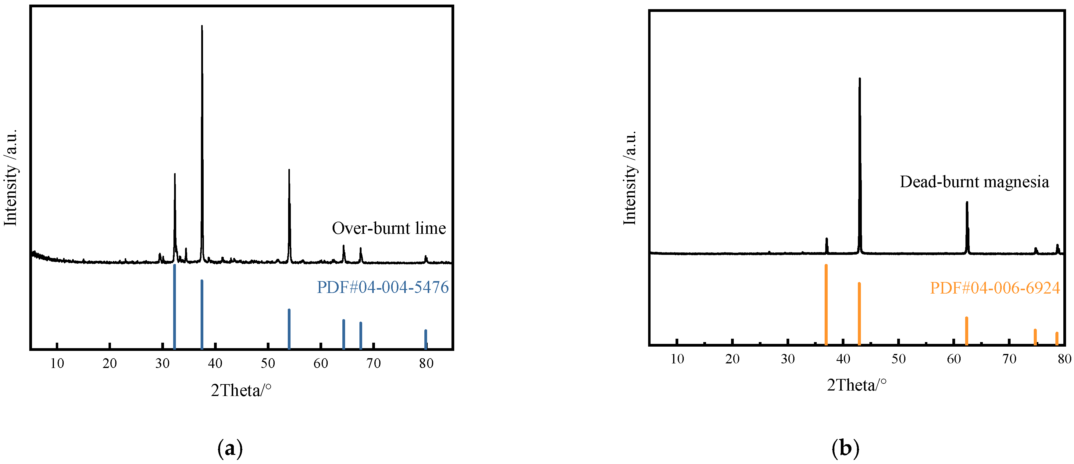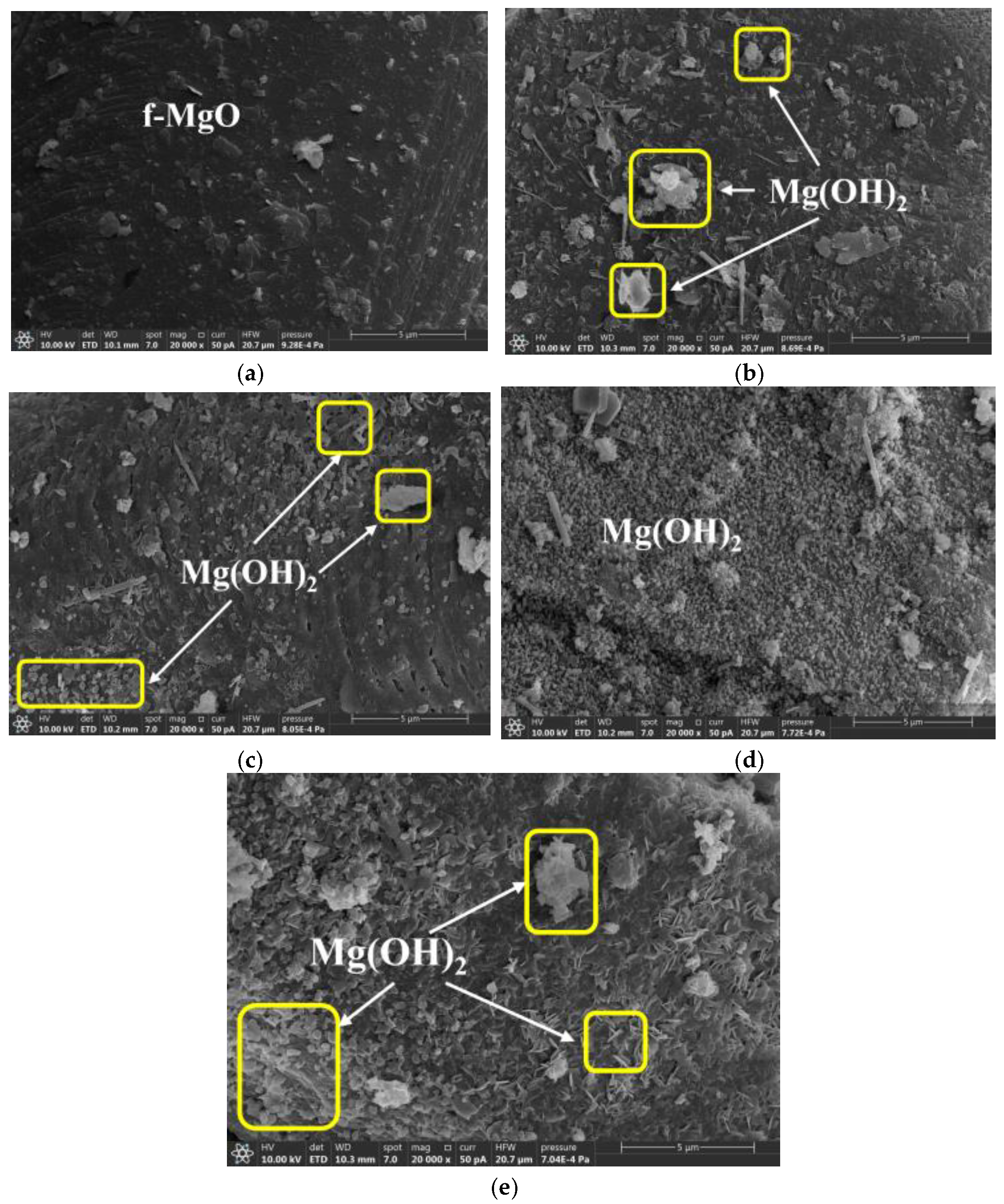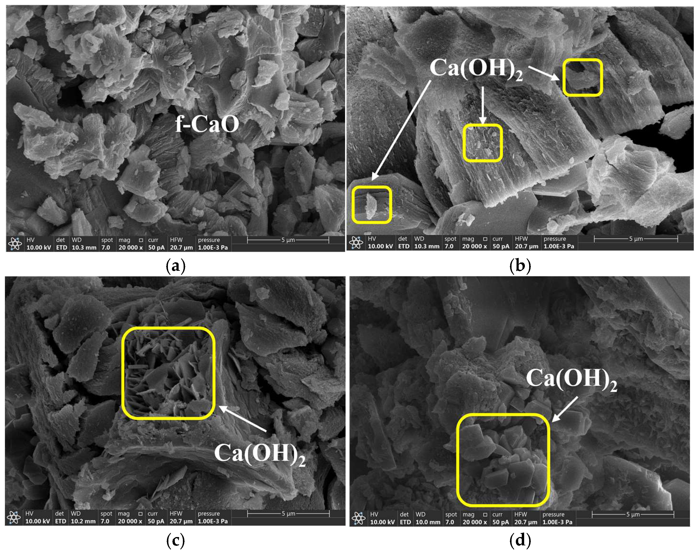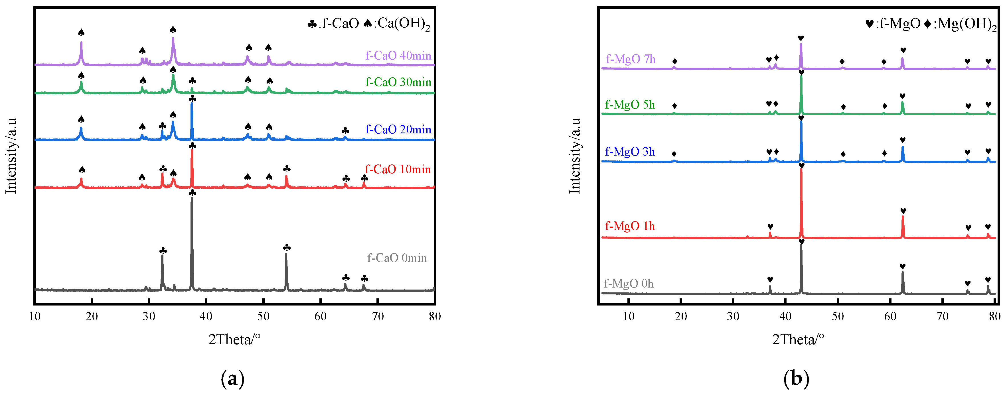 3.4.2. Analysis of Hydration Products of f-CaO and f-MgO