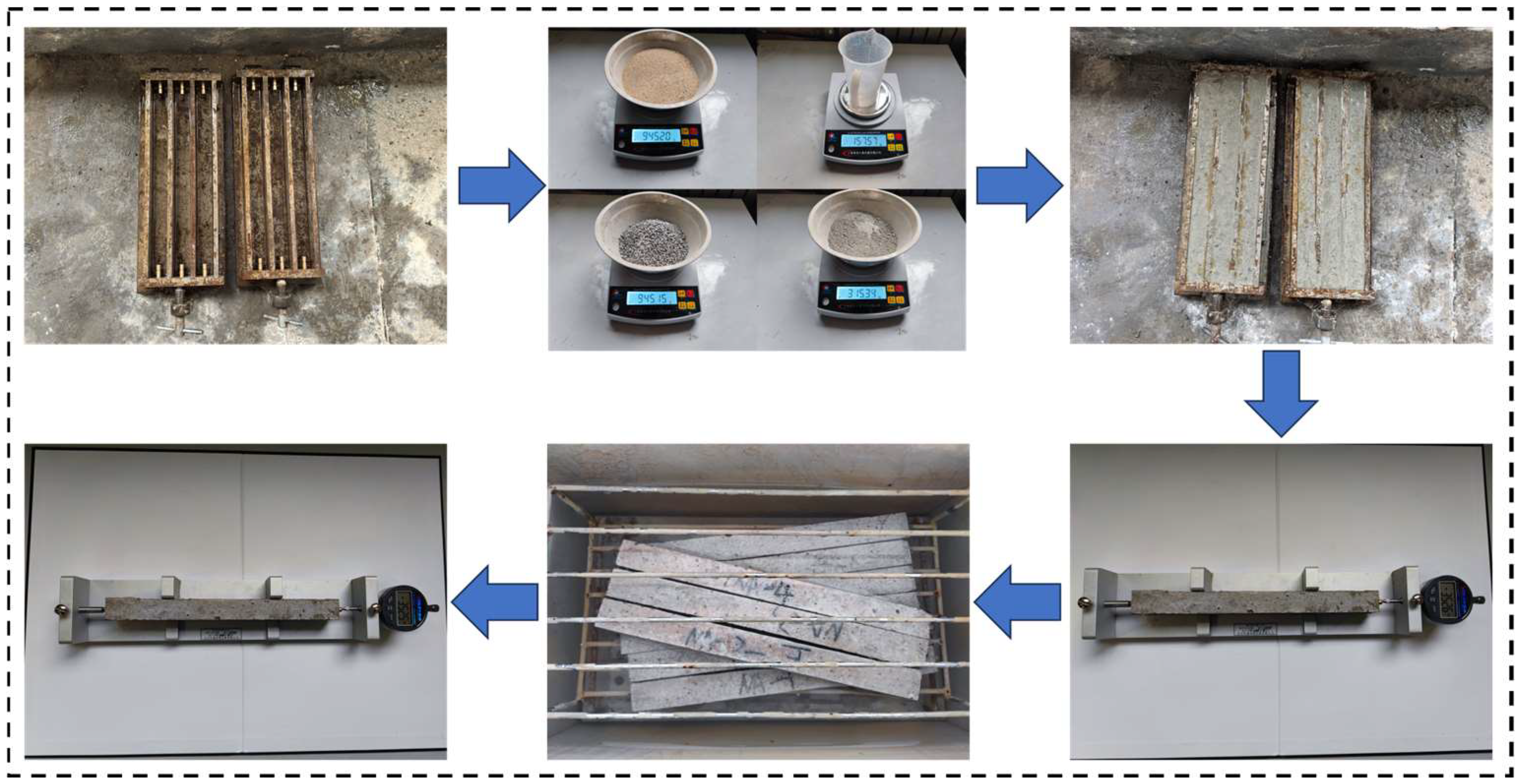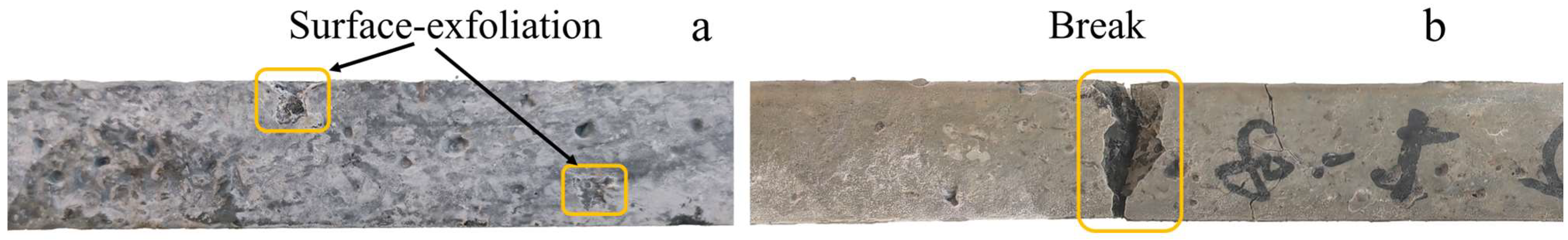 When the steel slag aggregate located near the mortar’s center interface expands, the surrounding cement matrix develops transverse cracks in response to the expansion forces. With continued expansion, these cracks gradually extend to the entire mortar cross-section, eventually leading to complete fragmentation of the mortar bar [