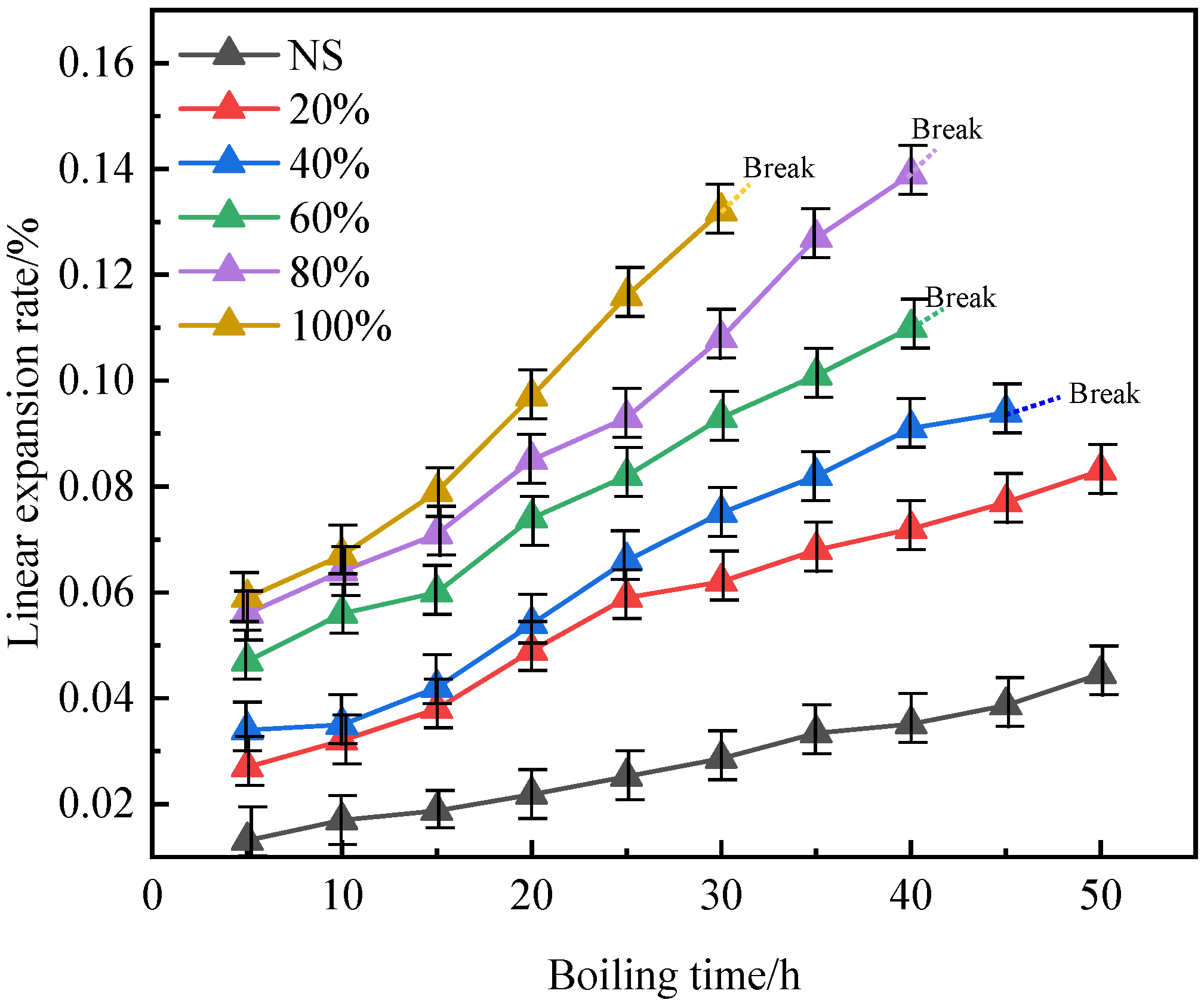 Figure 8 shows the influence of steel slag aggregate substitution rate on the linear expansion rate of mortar. The NA specimens had the lowest linear expansion of 0.045%, and the natural sand mortar specimens exhibited significant structural integrity after boiling with no cracking. However, the mortar specimens containing 20% steel slag aggregate admixture showed micro-cracks on the surface due to particle expansion.