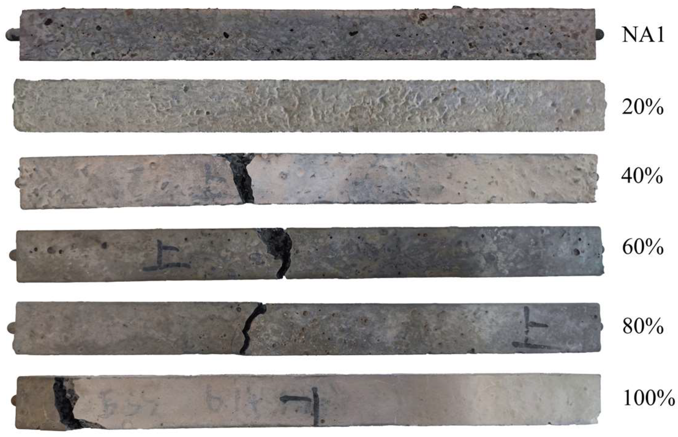 Figure 9 indicate that the 60% replacement group fractured slightly earlier than the 80% group in this test series. This apparent non-monotonic trend is attributed to specimen-to-specimen variability and the heterogeneous distribution of expansive slag particles (e.g., an expansive particle located close to the surface or near the mid-span can trigger earlier cracking). When considering the overall linear expansion level and the observed damage severity, the deterioration still becomes more pronounced with increasing steel slag replacement. We have clarified this point in