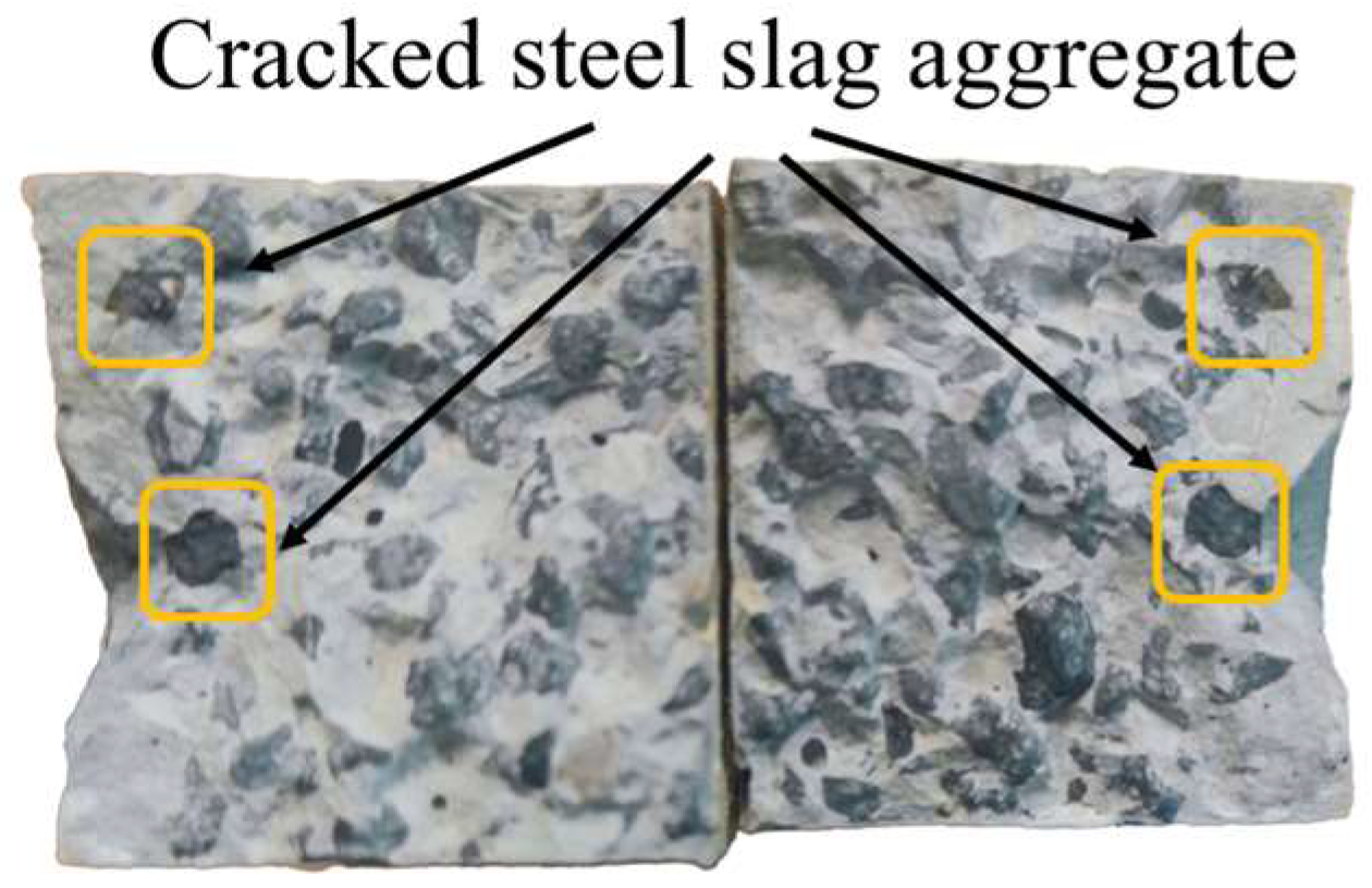 Figure 9), and the higher the dosage, the earlier all the specimens fractured. This further illustrates that the use of steel slag aggregate as aggregate creates serious stability problems.