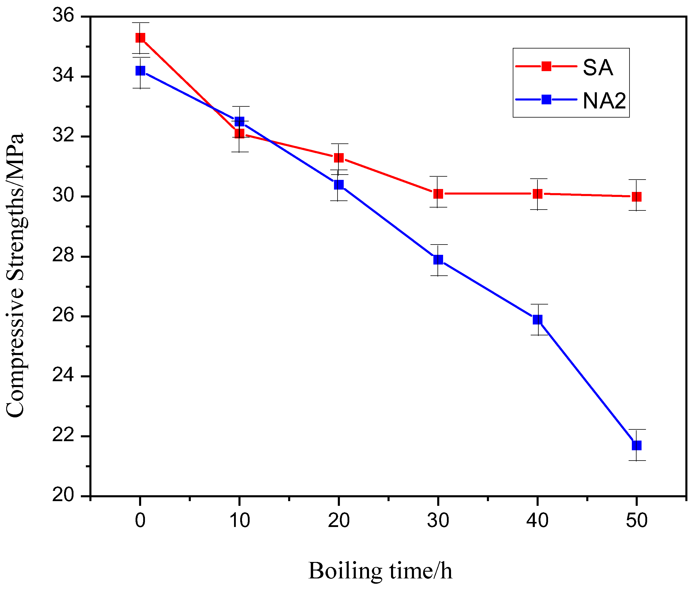 Figure 12 shows the compressive and flexural strengths of steel slag aggregate mortar and natural sand mortar after different boiling times.