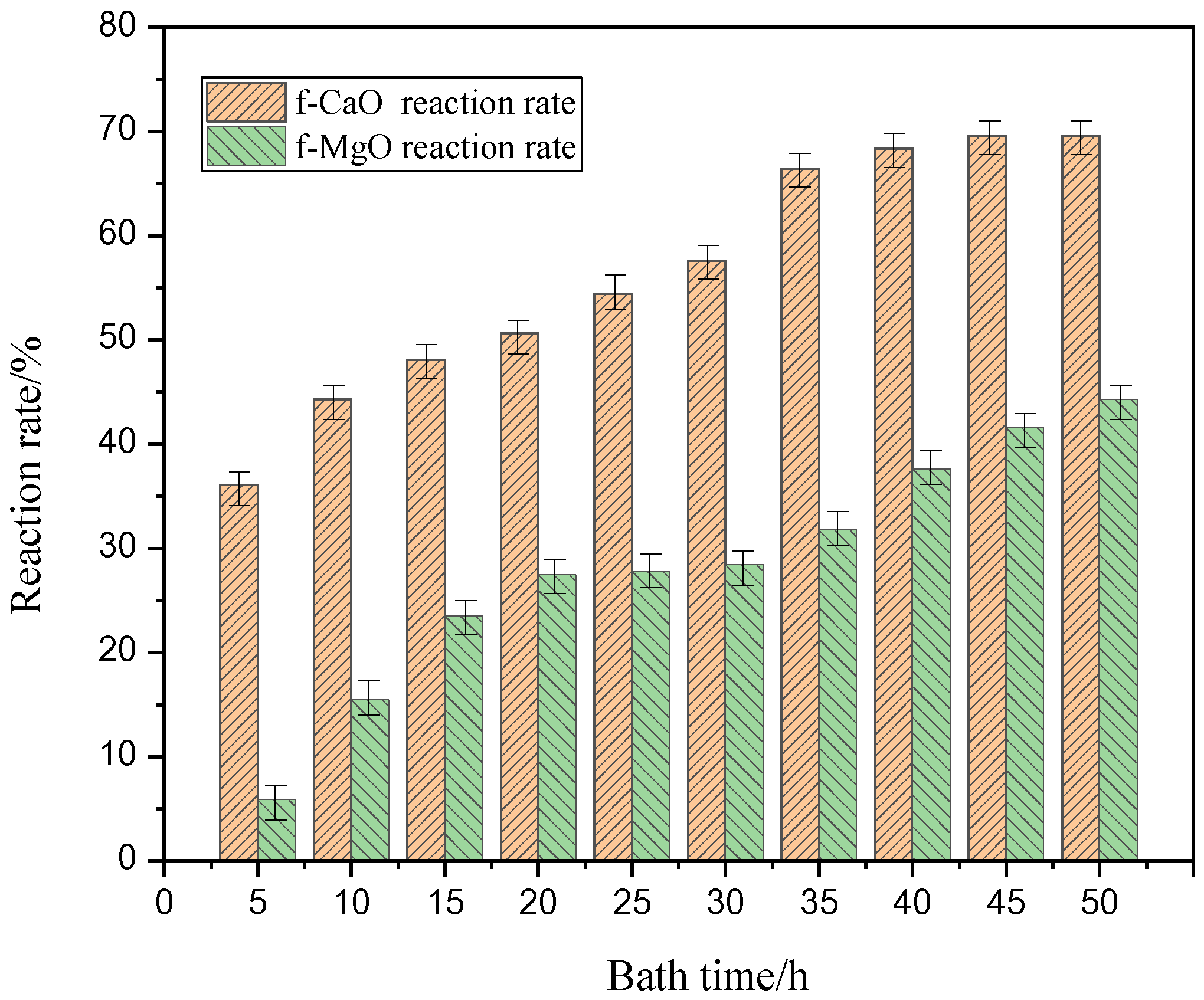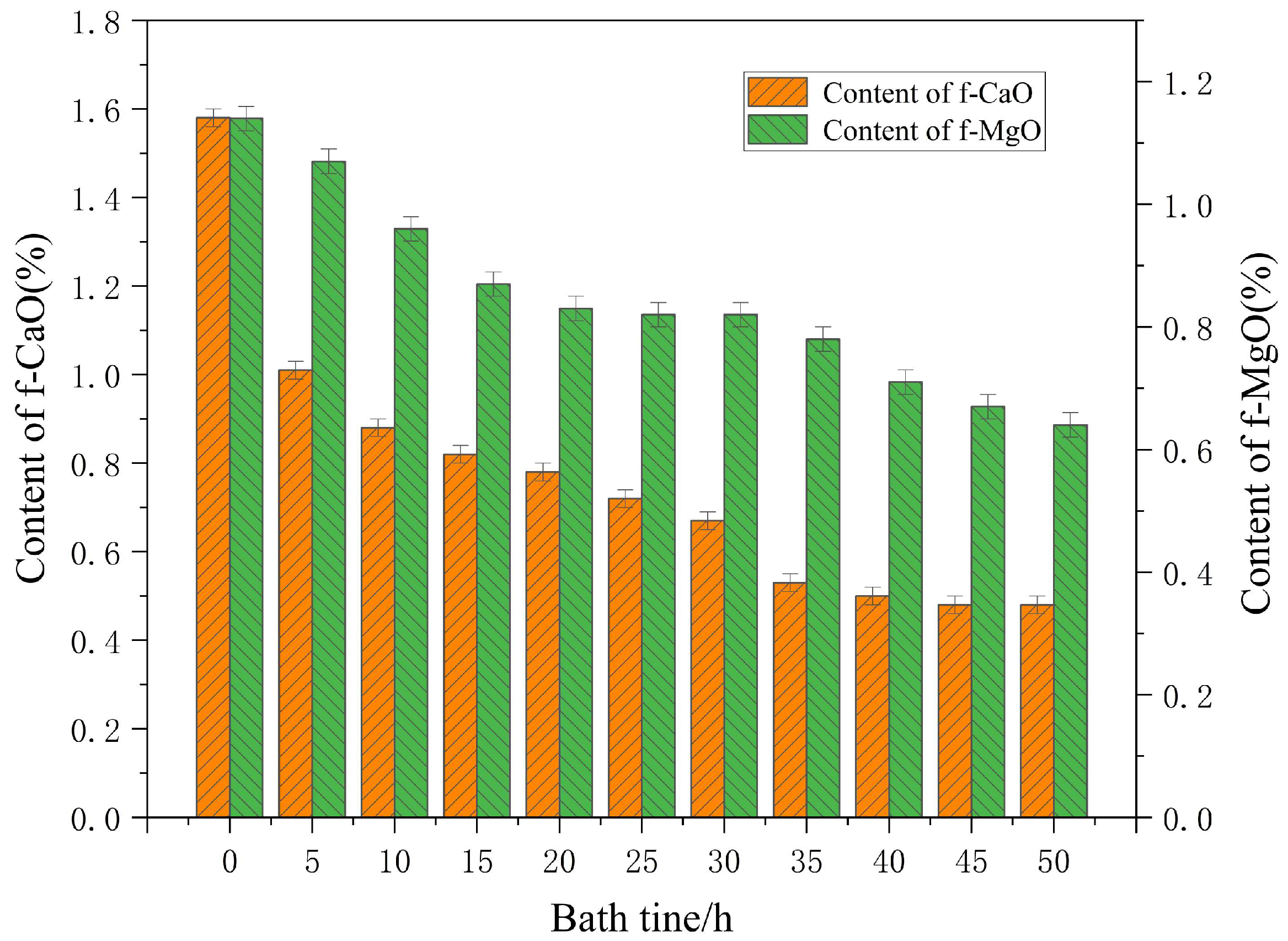 From the reaction rate after the water bath, the hydration activity of f-CaO is stronger, which has a greater impact on the initial stability, while the reaction rate of f-MgO is less than 50% after 50 h of water bath, which has poor hydration activity, and the hydration of f-MgO inside the steel slag aggregate is still difficult, which has a greater impact on the long-term stability.