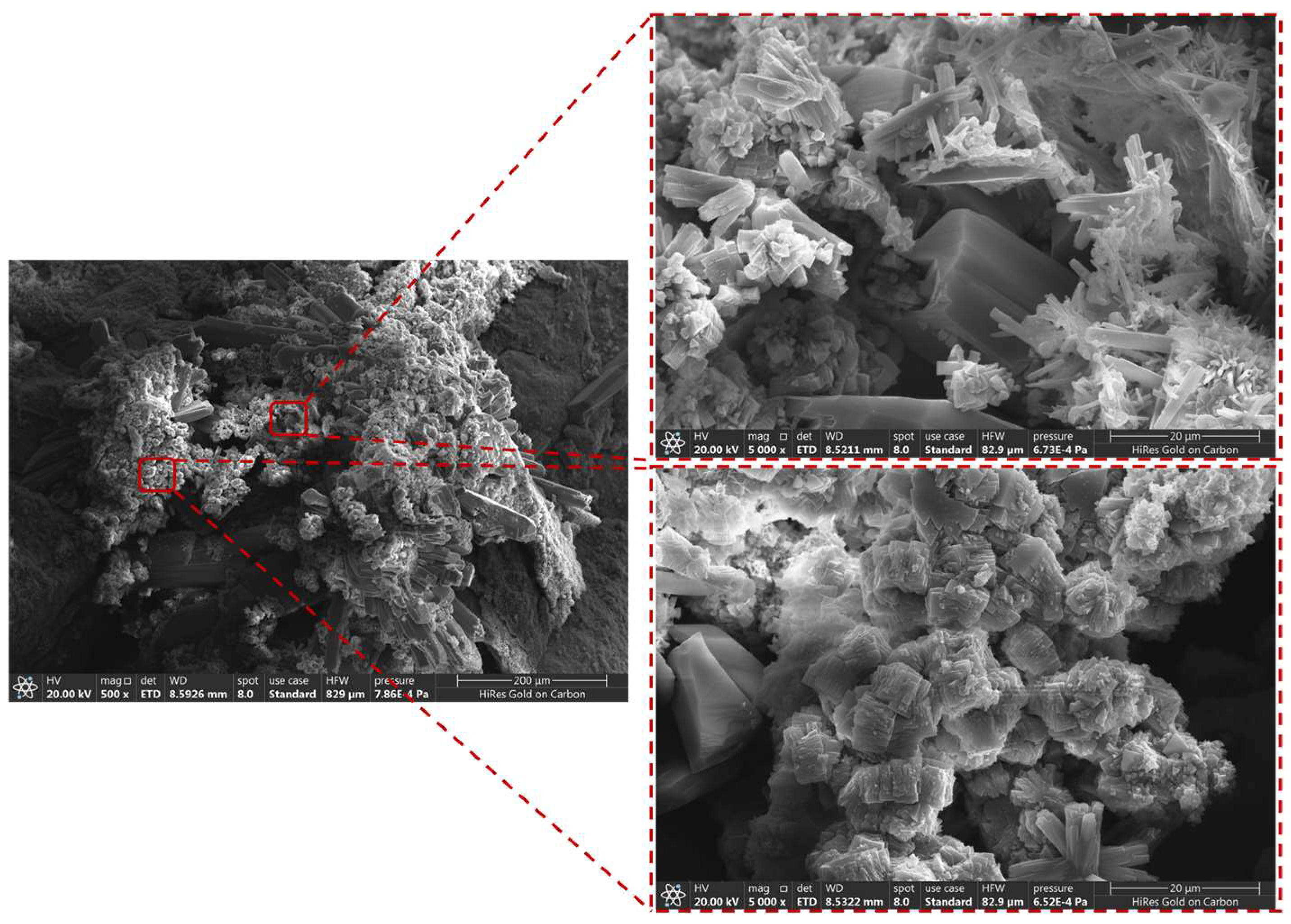 Figure 16 illustrates the microscopic morphology inside the cracked steel slag aggregate. It can be seen that there are obvious hydration products gathered at the cracks of the particles, which are Ca(OH)