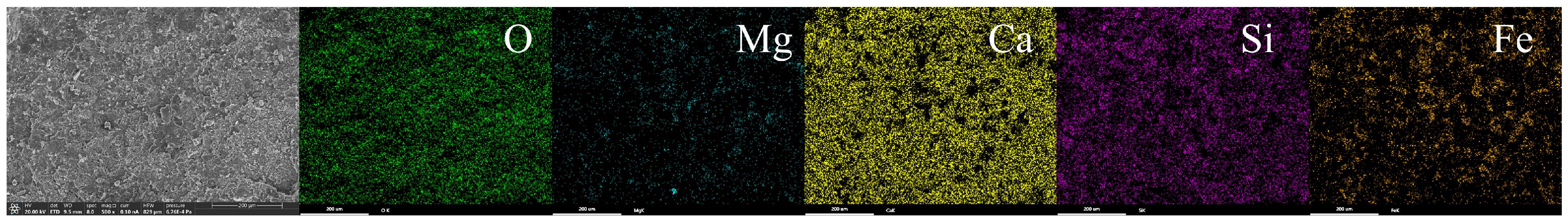 Figure 17) reveals the chemical composition of different steel slag aggregates. While the slag contains substantial CaO (>30%), most calcium exists in mineral-bound forms rather than as free oxides. The observed spatial correlation between Ca and O signals does not exclusively indicate f-CaO presence. Magnesium shows limited distribution in steel slag aggregate minerals, with low overall content, making Mg-O coincident signals more likely to represent f-MgO locations.