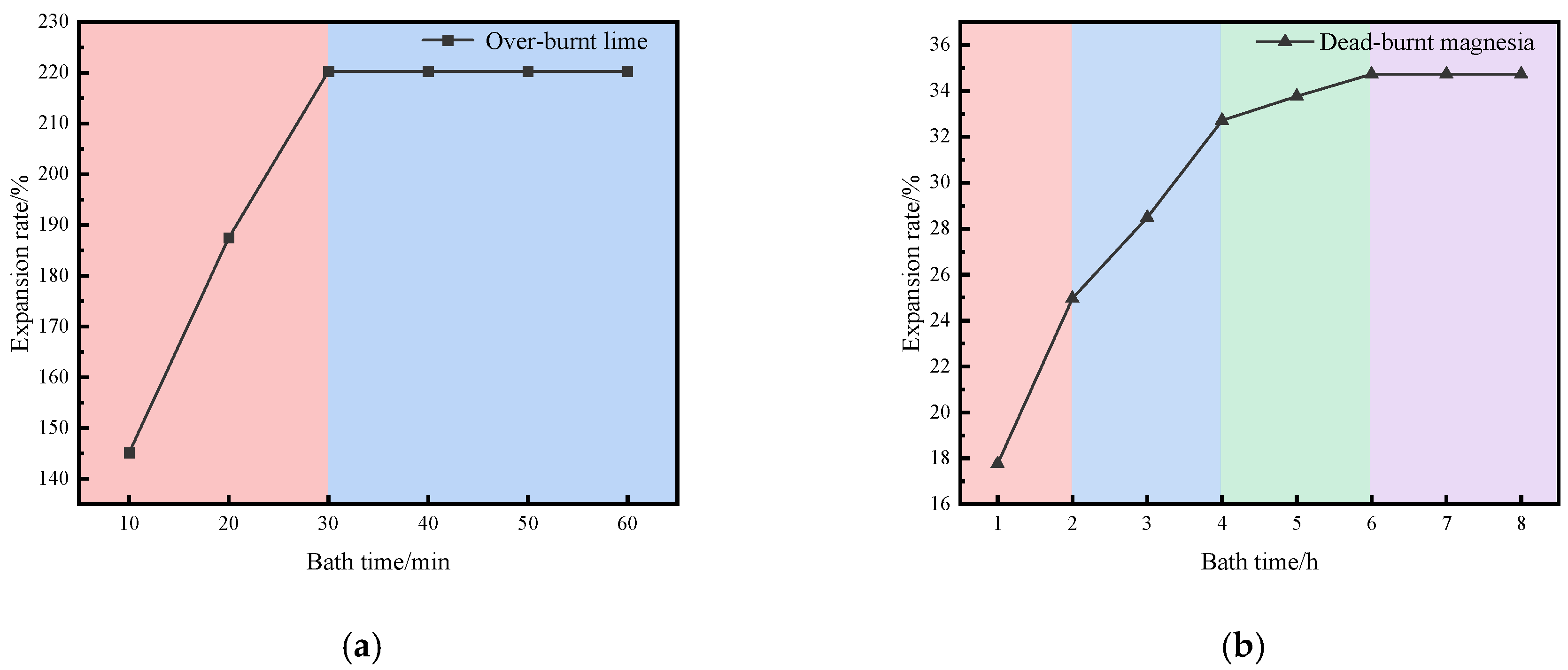 Figure 18. The reaction expansion of over-burnt lime reached 220% and ceased after 30 min, while the expansion of dead-burnt magnesia reached 35% and stopped increasing after 6 h.