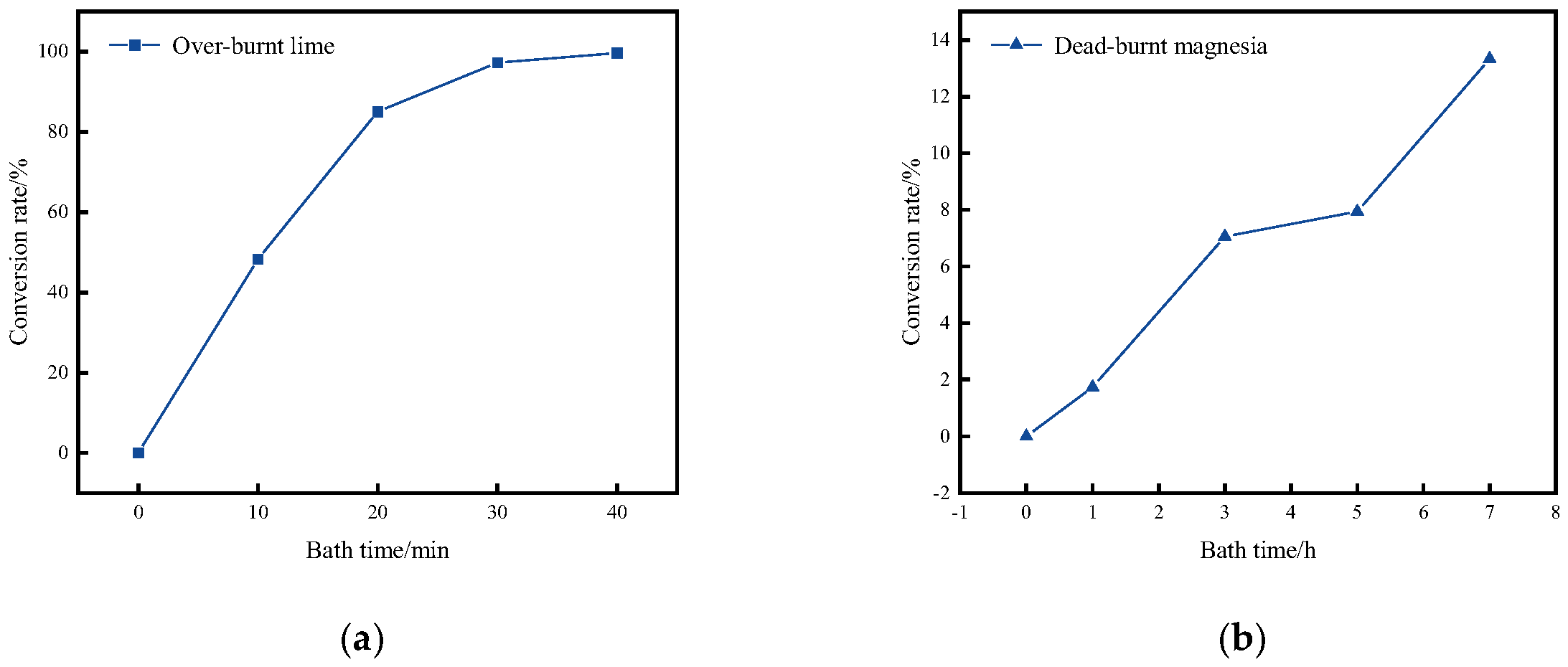 2, 81% of the roasted magnesium is still not reacted, and the reaction rate was only 13.3%. Dead-burnt magnesia does not undergo complete hydration under heating conditions alone.