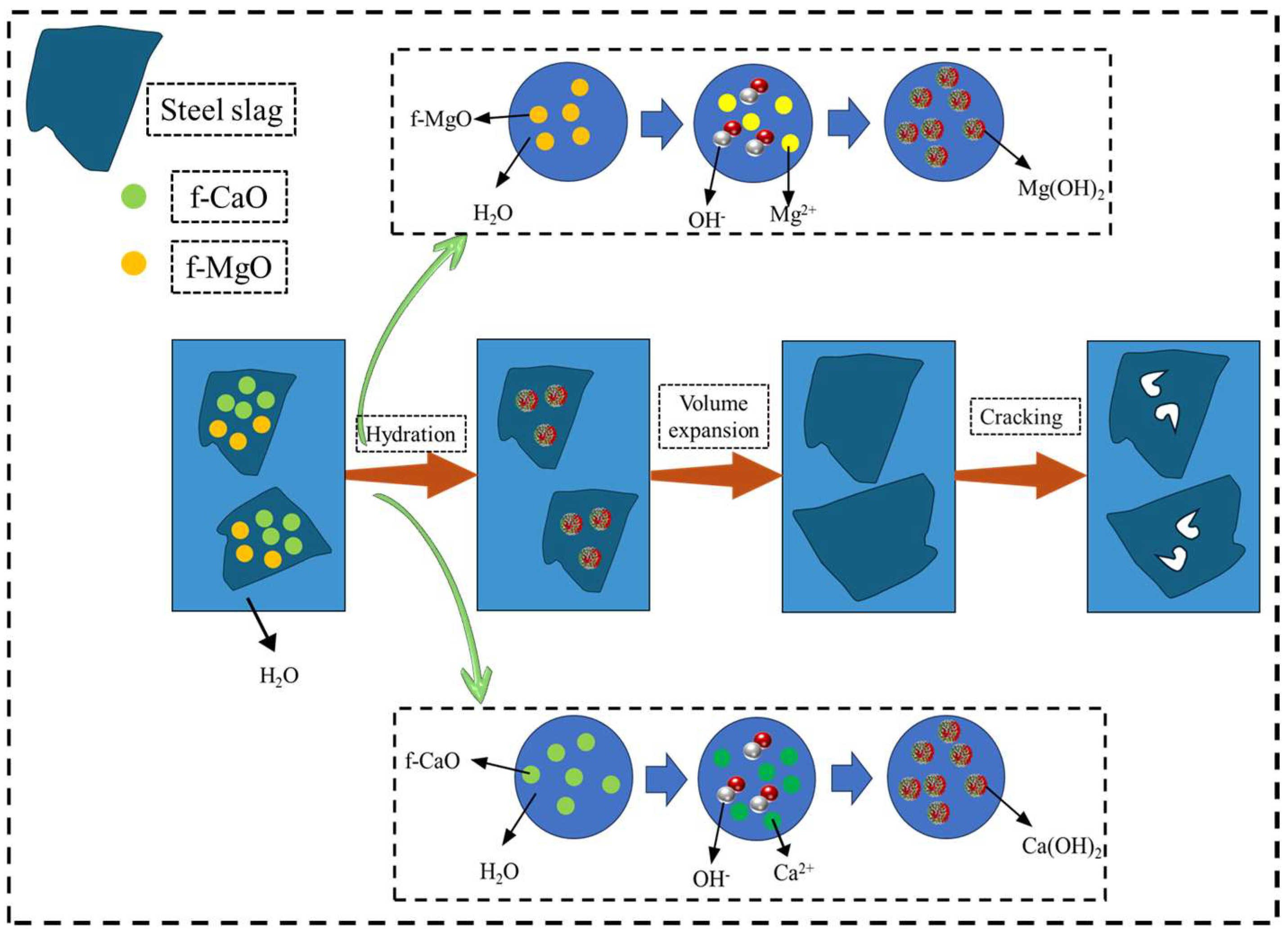 f-CaO and f-MgO cause cracking of steel slag aggregates, which generates stresses and leads to expansion and cracking of the mortar. Therefore, it is essential to analyze the effect of f-CaO and f-MgO hydration and swelling on the particles.