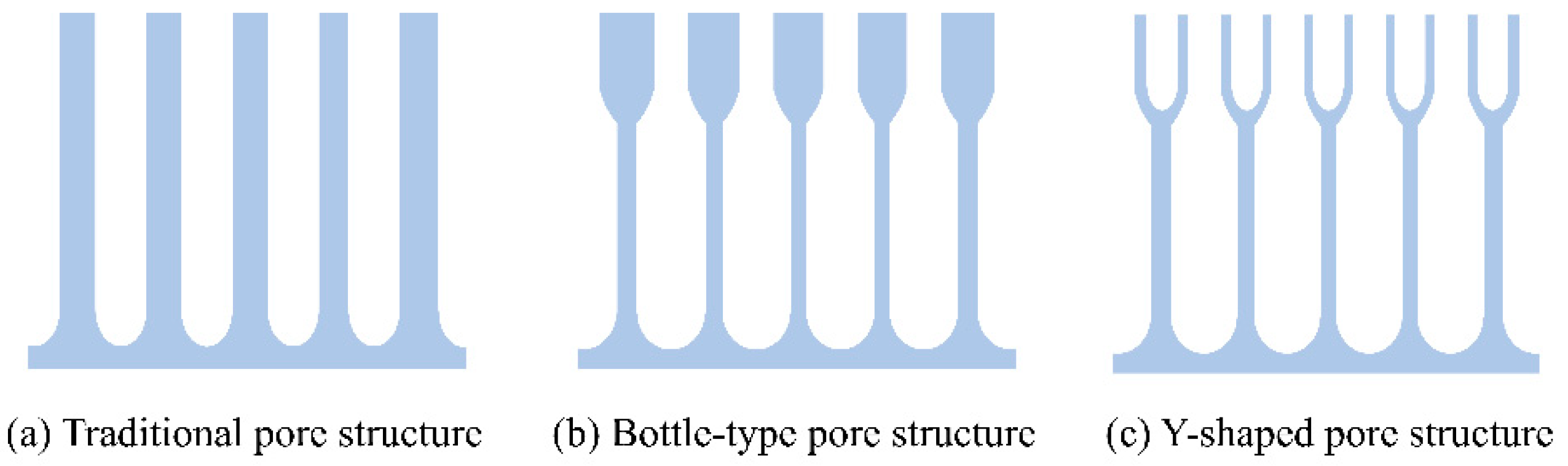 | NO. | Current Density (A/cm2) | Pore Size of Upper Layer (nm) | Surface Porosity (%) | Pore Size of Lower Layer (nm) | Upper Film Thickness (μm) | Lower Film Thickness (μm) | Pore Volume of a Y-Shape (10−20 m3) |