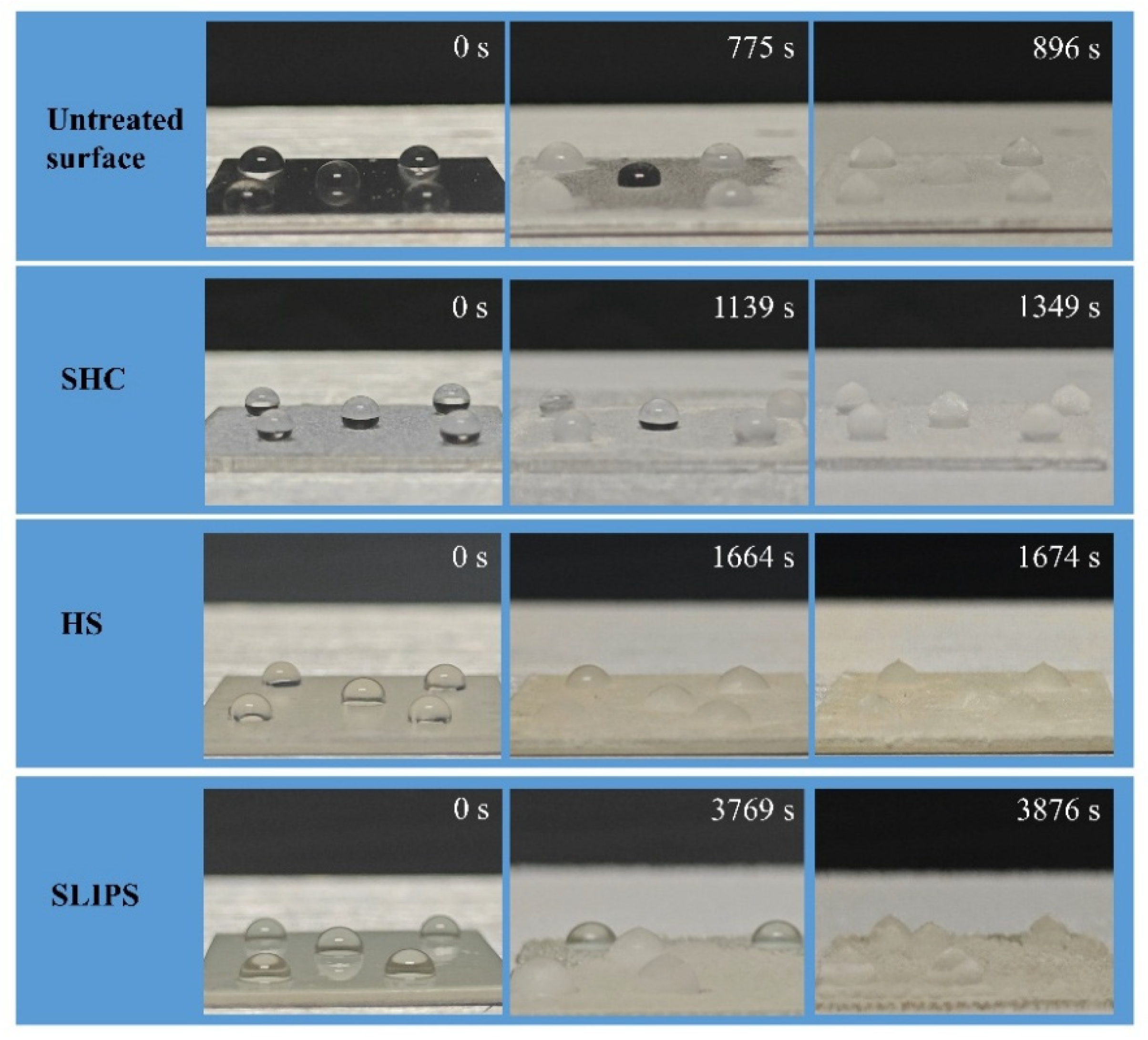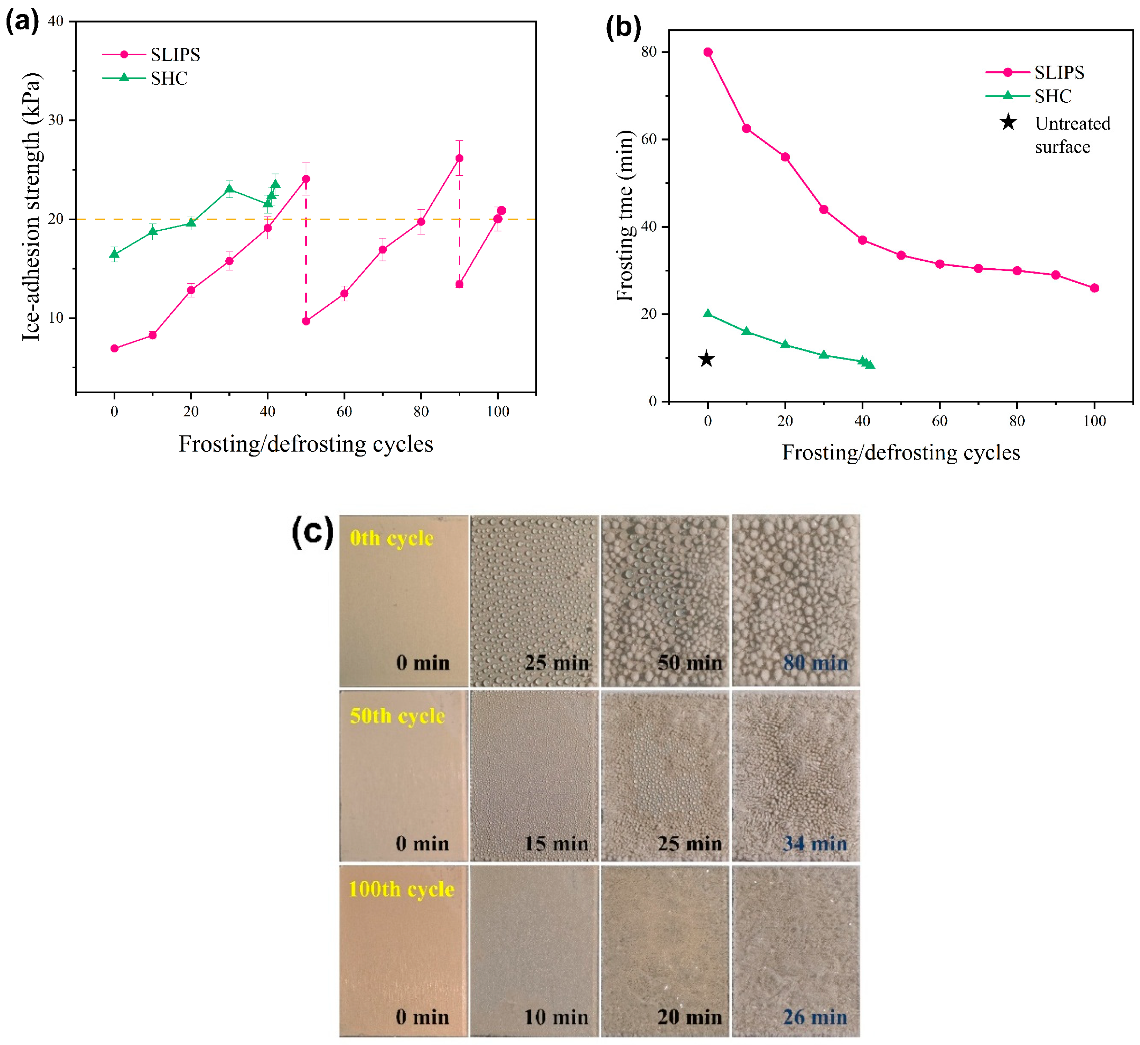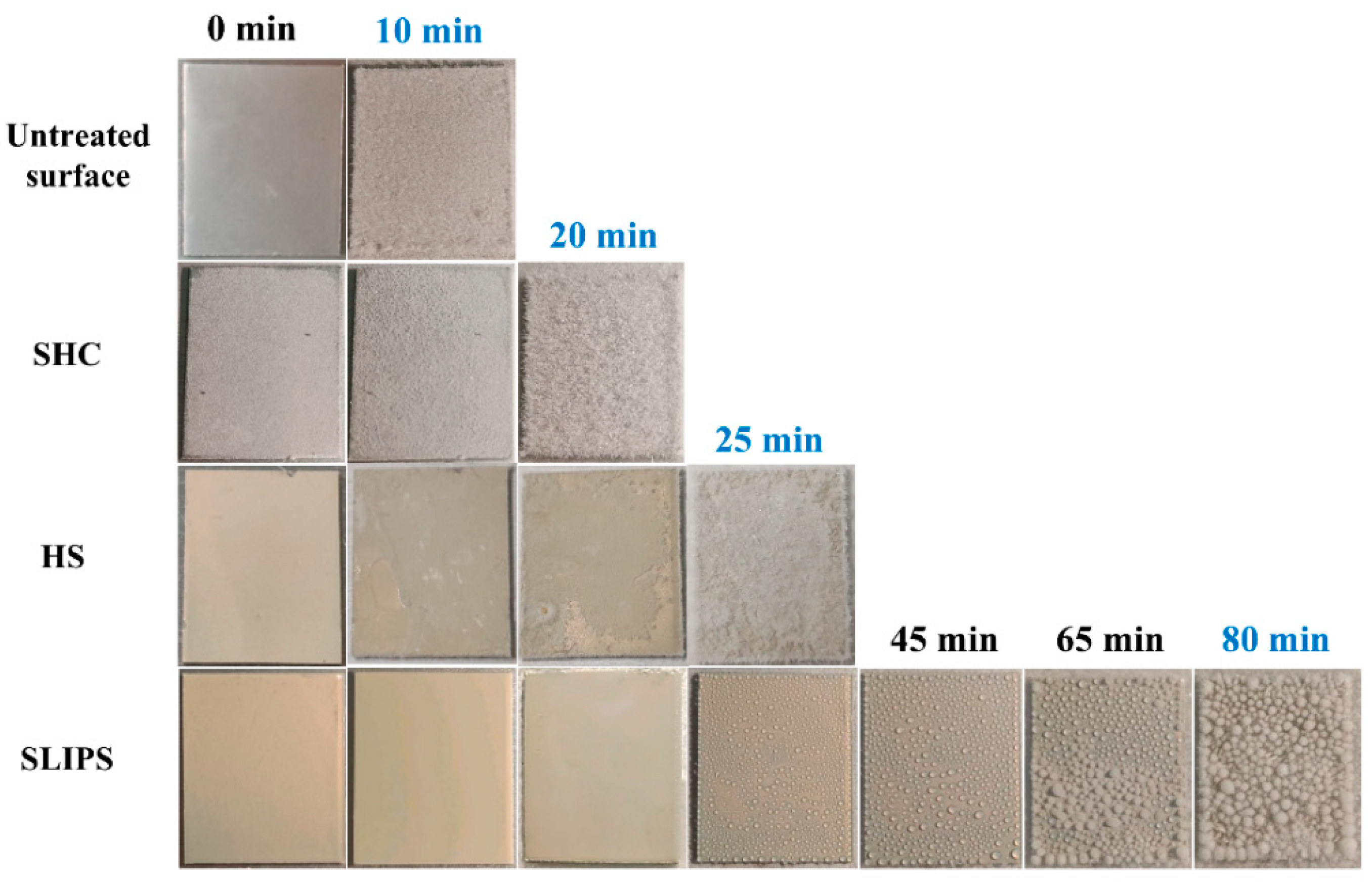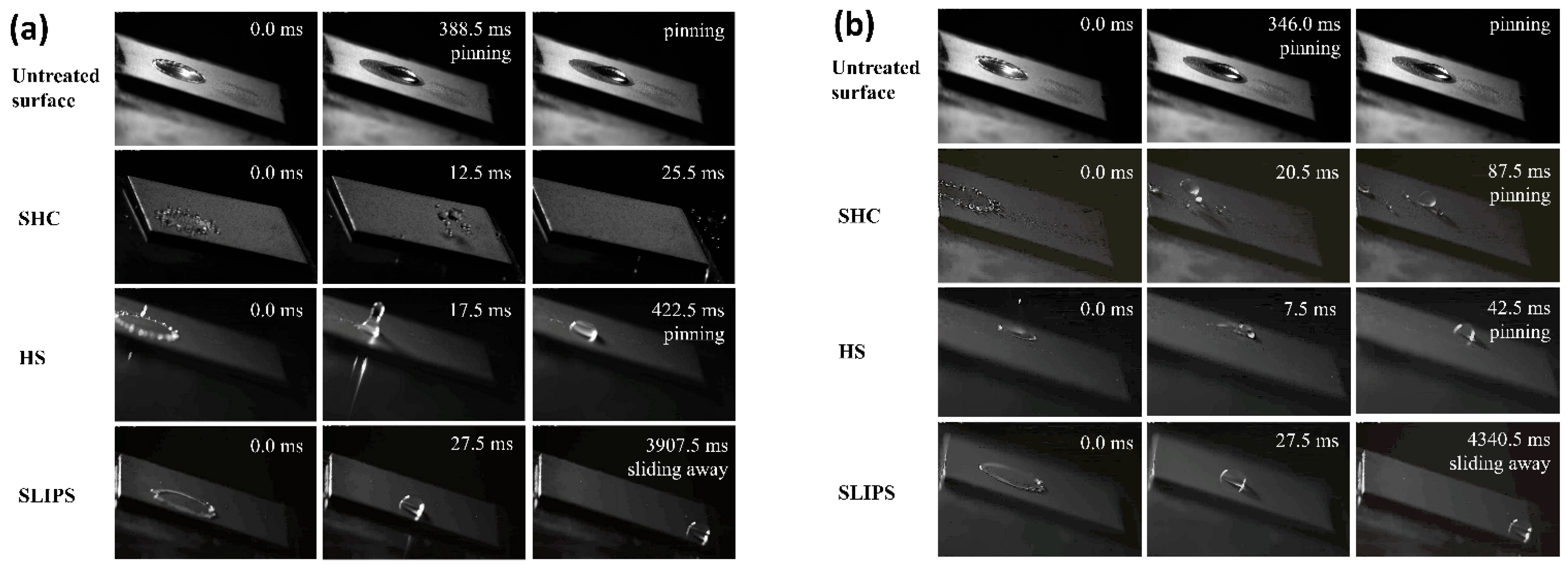 - Yu, Z.; Zhang, H.; Yang, Y.; Wang, B.; Guo, Z. Slippery Liquid-Infused Porous Surfaces (SLIPS) for Anti-Icing. Mater. Today 2025, 88, 906–932. [Google Scholar] [CrossRef]