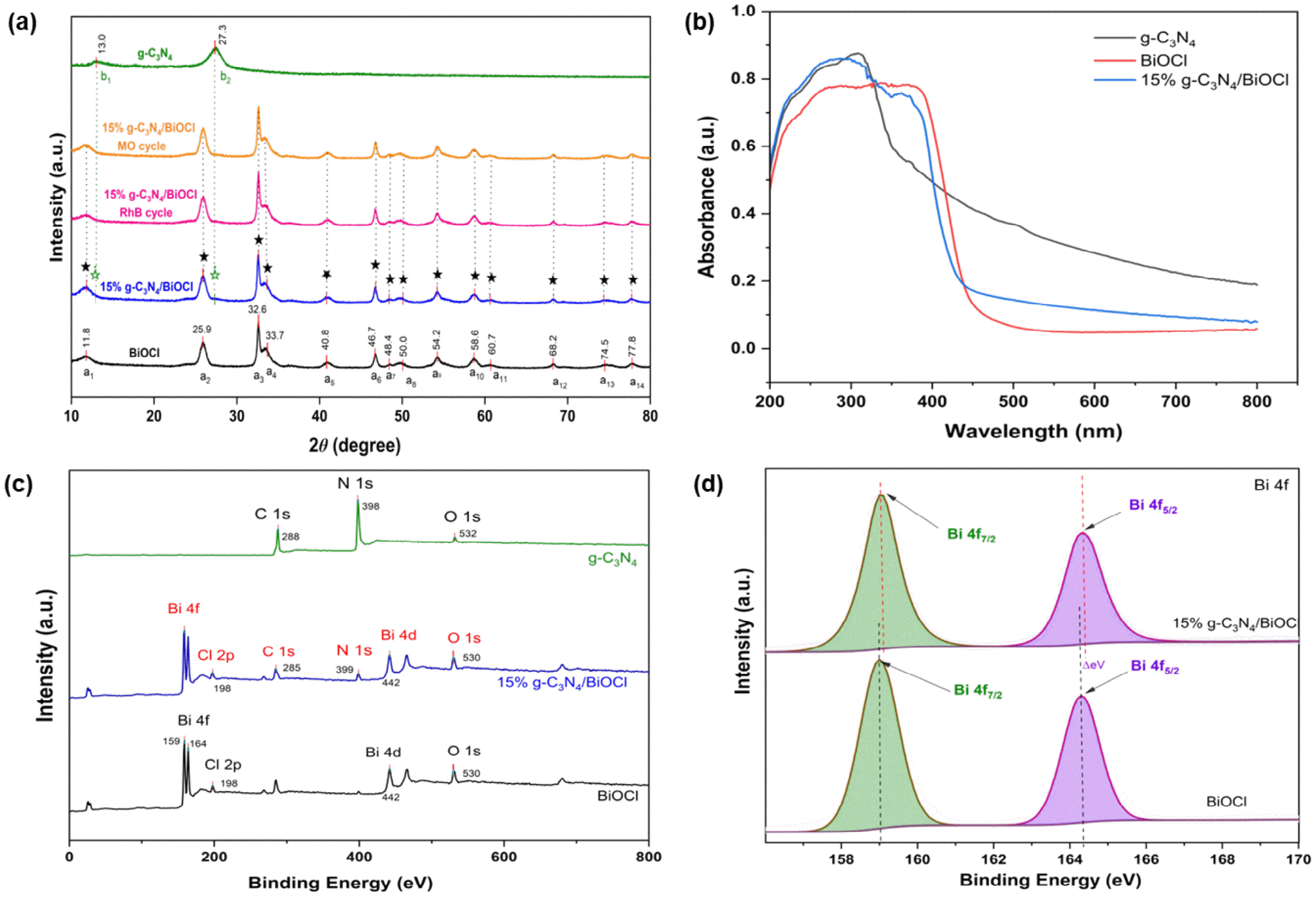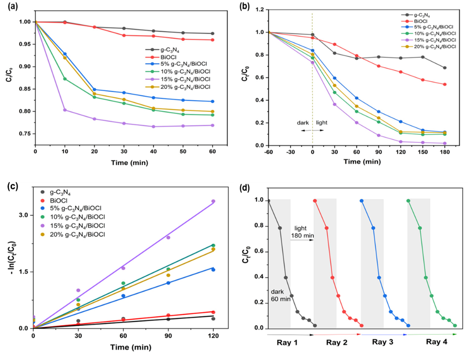 - Su, Y.; Gao, Z.; Zhang, L.; Zhang, B.; Xu, R.; Cheng, X.; Lia, N.; Zhao, W. g-C3N4-modified BiOCl as a visible light catalyst and its enhanced photocatalytic degradation/sterilization performance. Catal. Sci. Technol. 2025, 15, 2261–2271. [Google Scholar] [CrossRef]